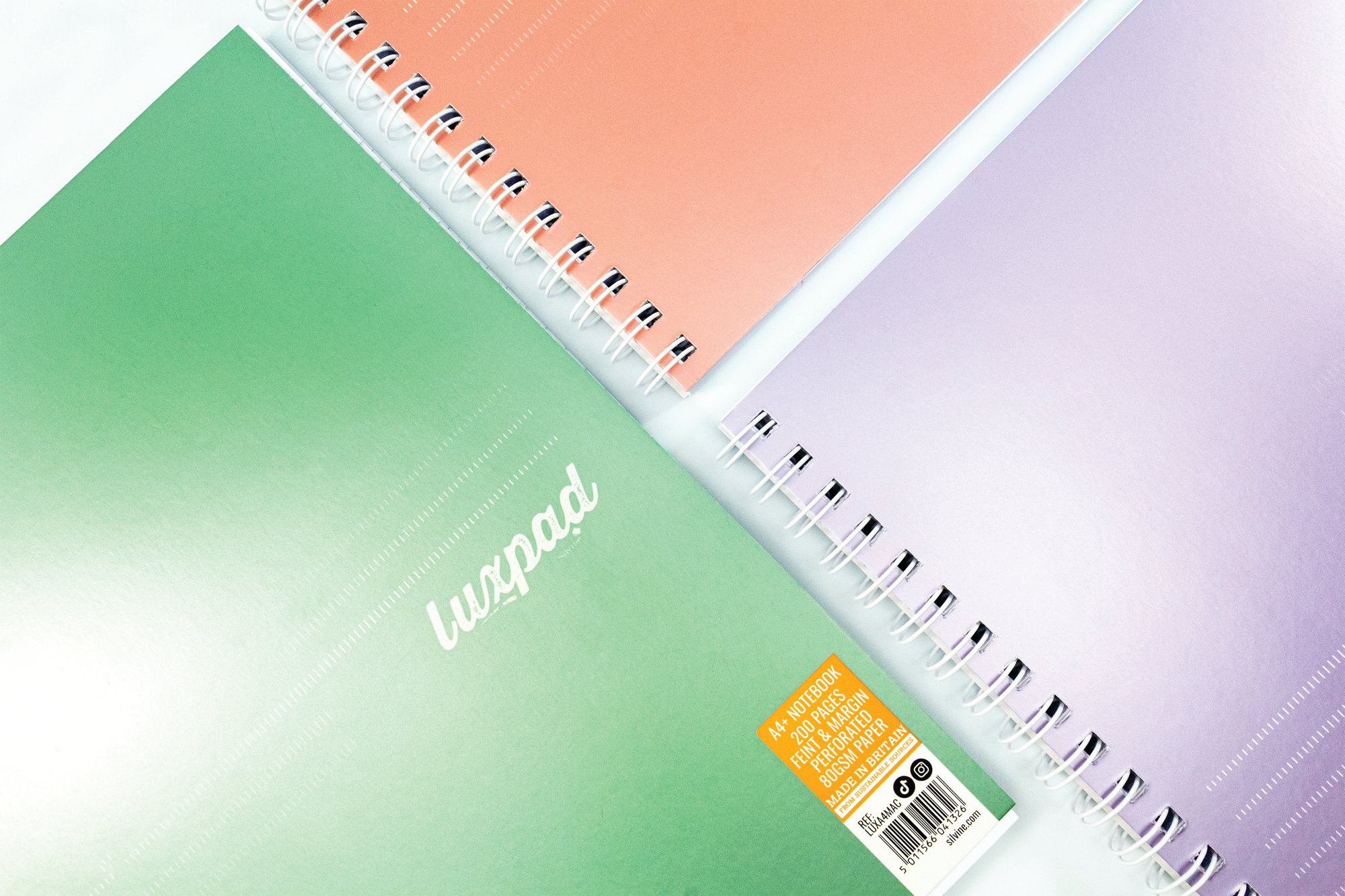 These A4+ wirebound notebooks by Silvine are part of the Luxpad range. They feature 200 pages of high quality 80gsm white paper, ruled 8mm feint with margin. The pages are micro-perforated and punched for filing while the wire binding allows the notebooks to lay flat and makes page turning a breeze. The three Metallic covers in this assorted pack are gloss sealed making them more durable and offering additional wipeability. The pack features 3 Assorted metallic colours: Terracotta, Lavender and Sage.