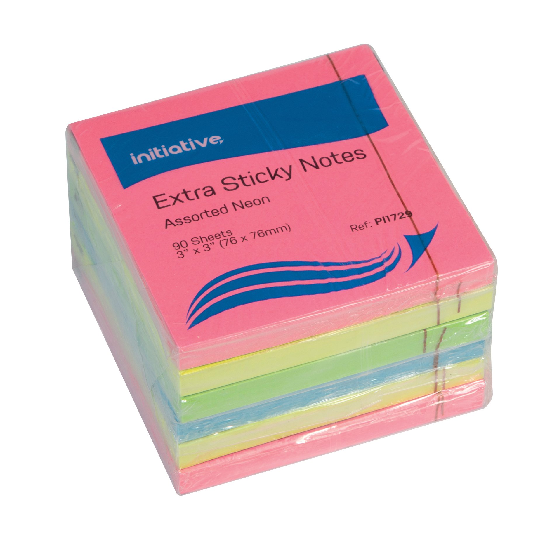 Initiative Extra Sticky Notes Assorted Neon Colours 76x76mm 90 Sheets Per Pad