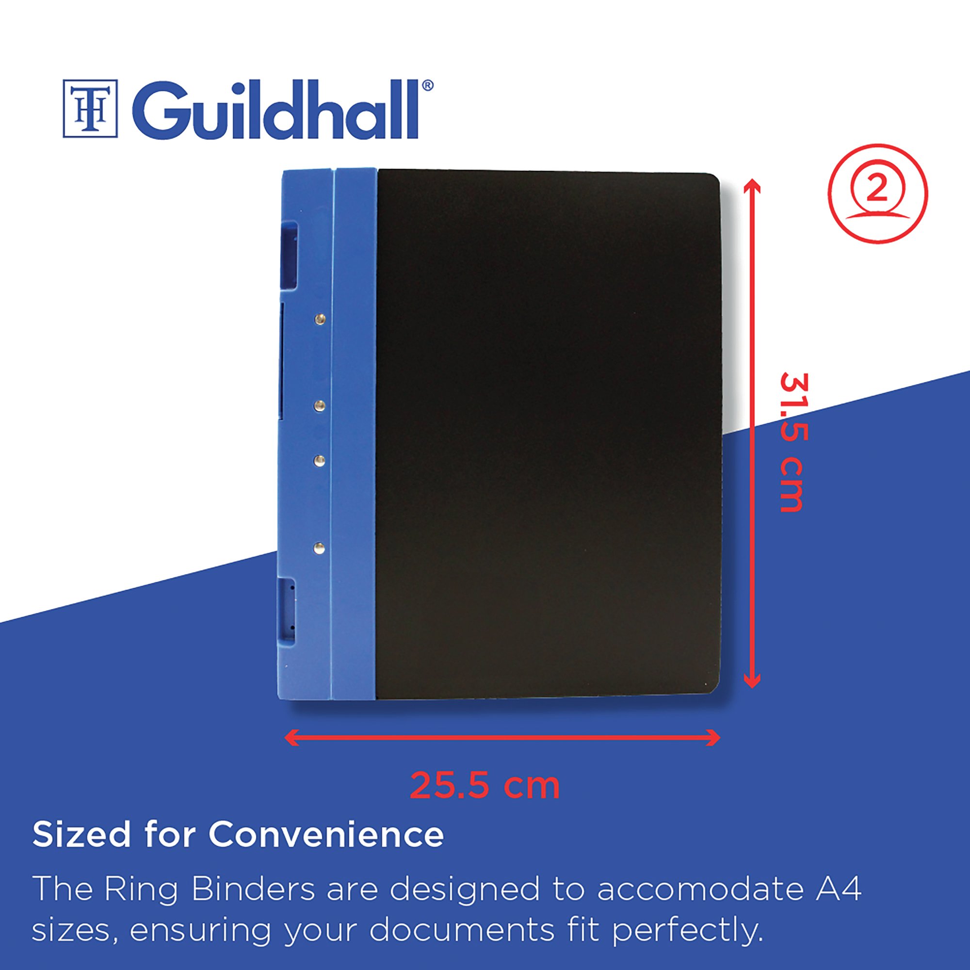 Suitable for filing A4 documents, this extra heavy duty Guildhall GL Ergogrip ring binder features a wide 2 ring mechanism and 55mm spine with double recesses for easy handling. Designed for frequent use, the binder features durable black polypropylene covers and can hold up to 400 sheets of A4 80gsm paper. Ideal for colour coordinated filing, the binder has black covers with a bright blue spine. This pack contains two A4 binders.