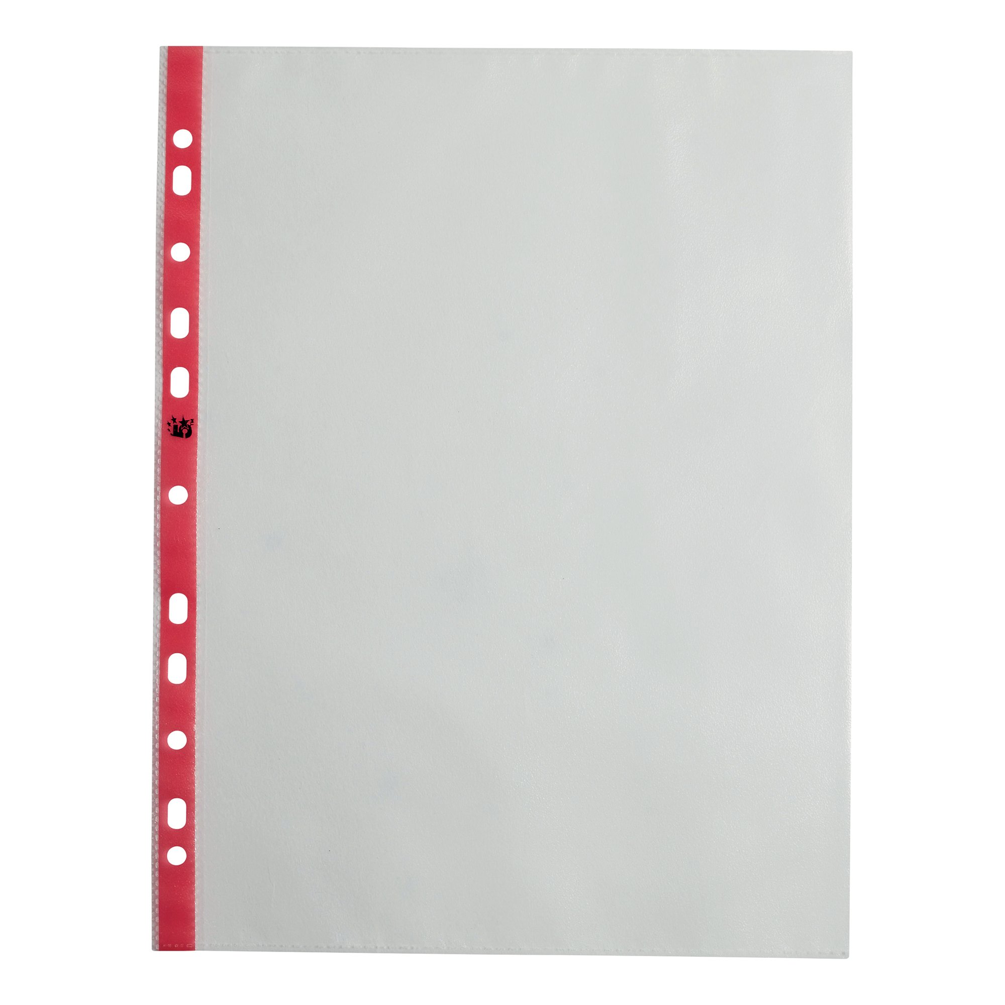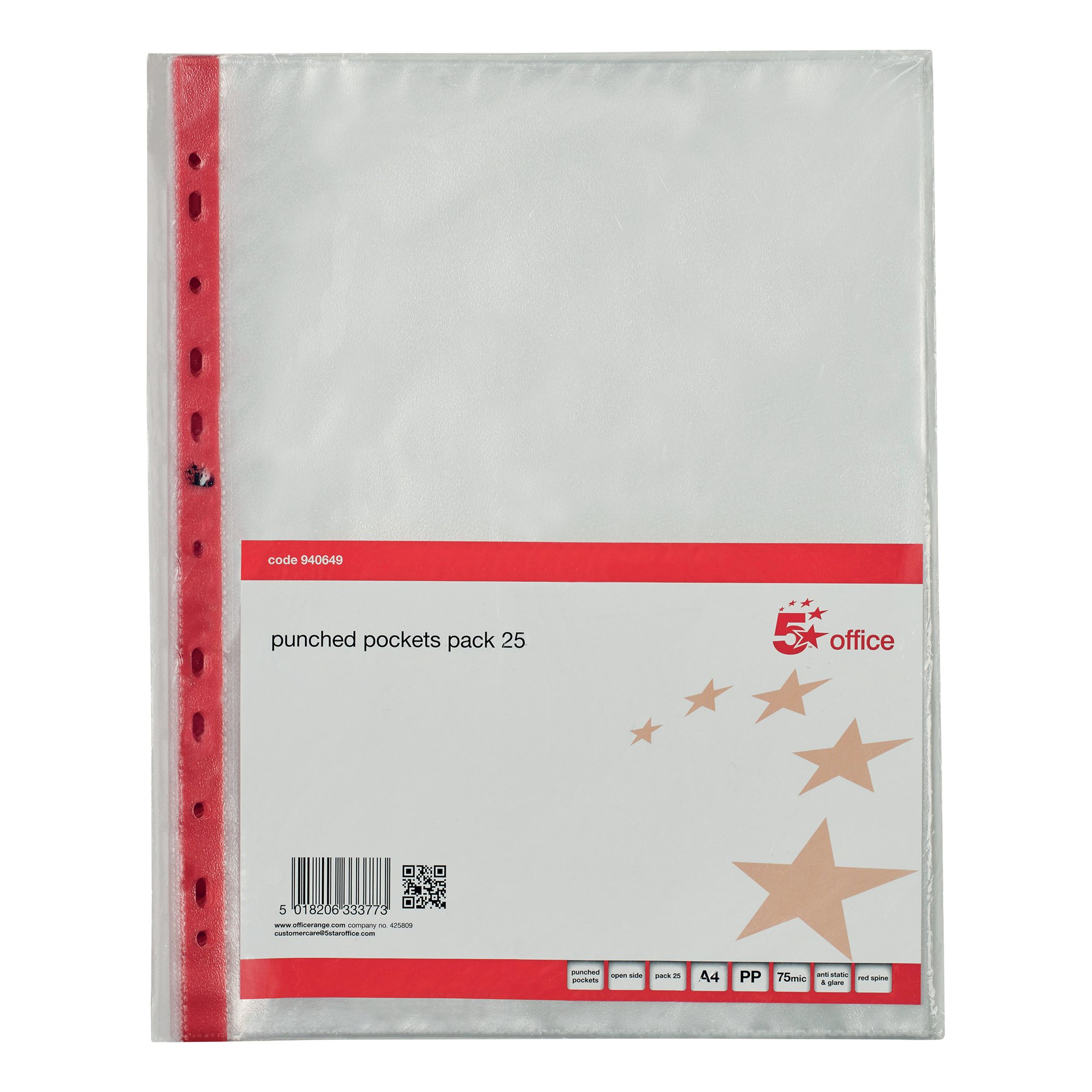5 Star Office is a competitive range of office stationery. These A4 punched pockets securely store your important paperwork with top opening. Made of durable polypropylene which is copy-safe to protect your written and typed A4 documents, and that allows you to flip pages with ease. As it is glass clear, you can use this document pocket to display projects, paperwork, catalogues and magazines at meetings or conferences. Reinforced red multi-punched strip, allowing you to store unpunched documents in a ring binder or lever arch file.