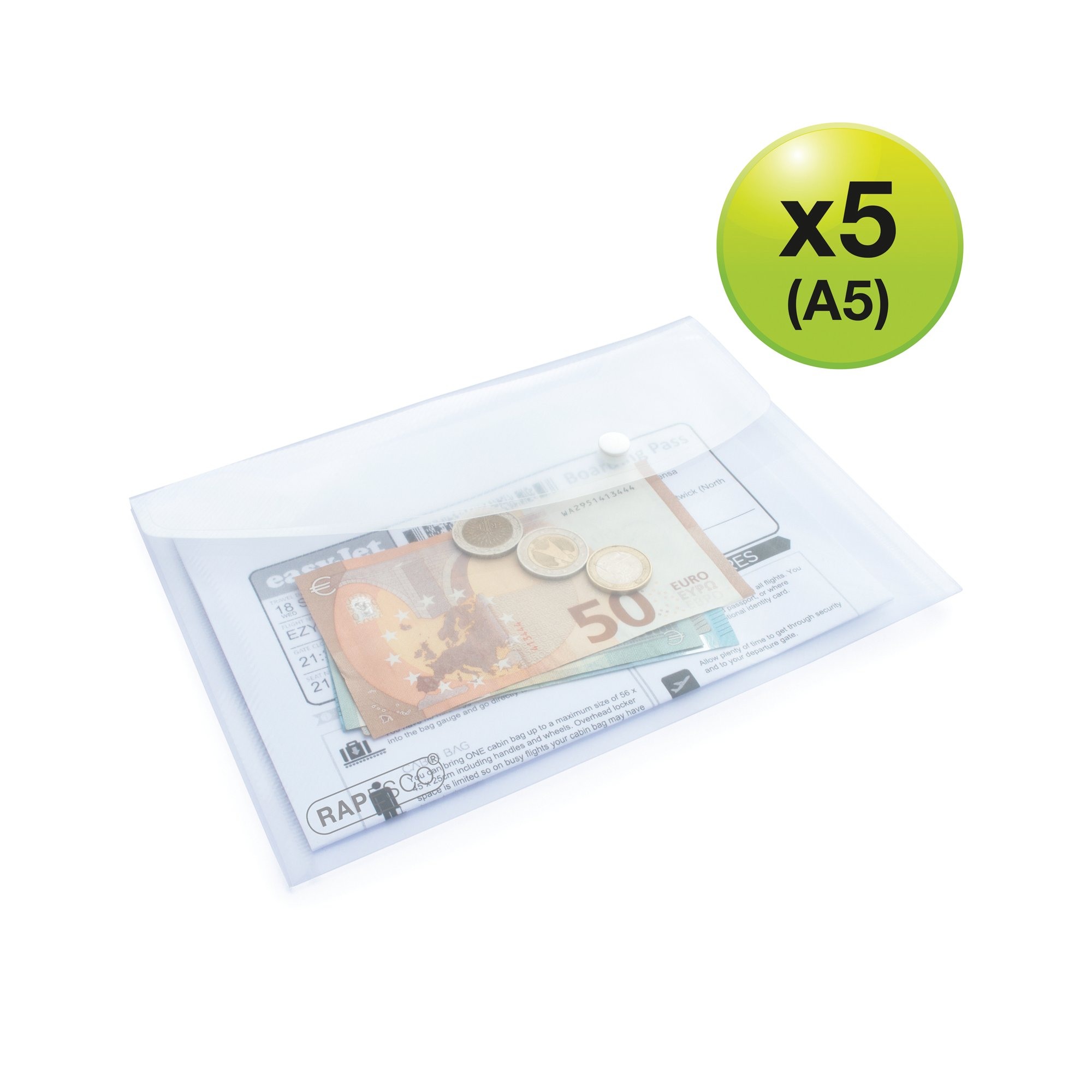 A5 plastic popper wallets made from durable recycled polypropylene. Featuring a white press-stud closure on the curved fold-over flaps, these folders keep contents safe and secure, making them perfect for general storage and holding loose papers at the office, at home, or on the go. Featuring a handy pen holder cutout under the curved flap and a large capacity of 75 sheets of 80 gsm paper, up to A5 in size, these files come in convenient packs of 5.