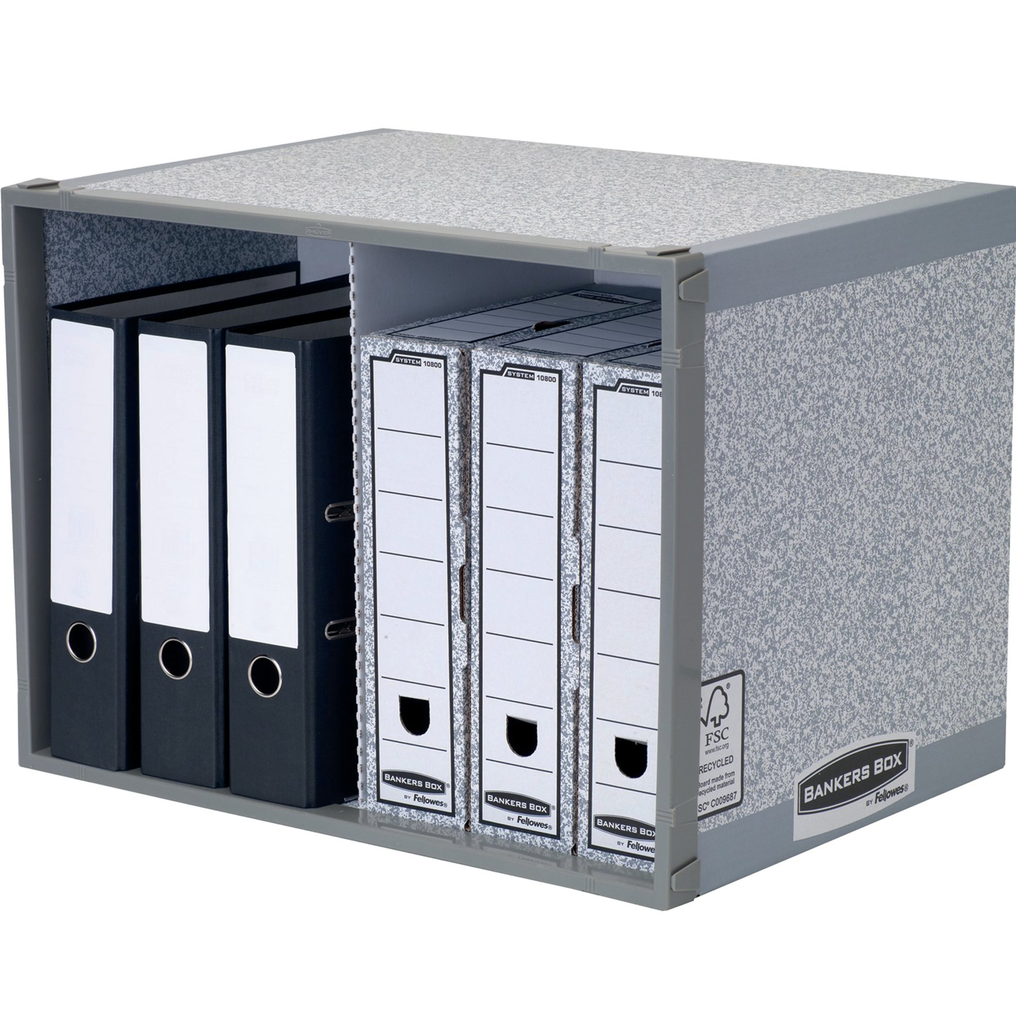This heavy duty Bankers Box Stax file store features a steel reinforced frame, which interlocks vertically or horizontally and is stackable up to 7 units high. Designed for long term storage, the file store is compatible with ring binders, magazine files and A4 or foolscap Bankers Box transfer files. This pack contains 5 file stores measuring W540 x D400 x H390mm (external).