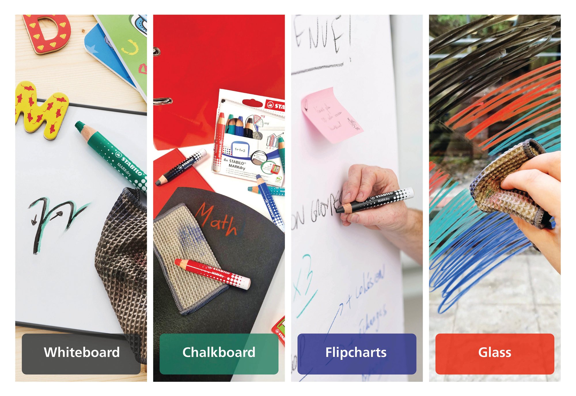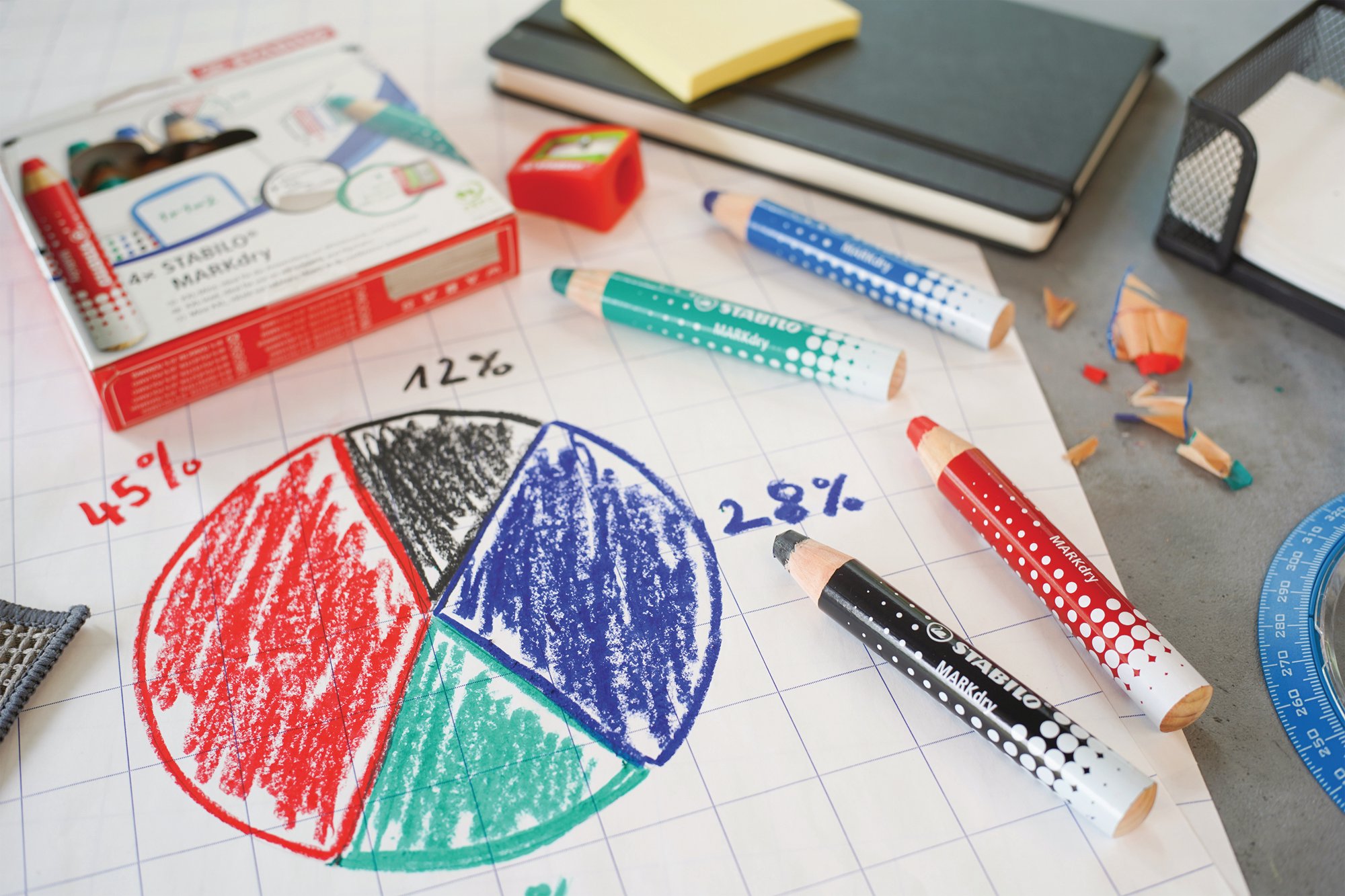 The Stabilo Markdry marker pencil is ideal for use on whiteboards, chalkboards, show me boards, glass and flipcharts. Easily erased with a damp or dry cloth on non-porous surfaces or washed off hands and clothes, these sustainable pencils with odourless and solvent-free lead last up to five times longer than a liquid whiteboard marker. This pack includes five Markdry pencils in black.
