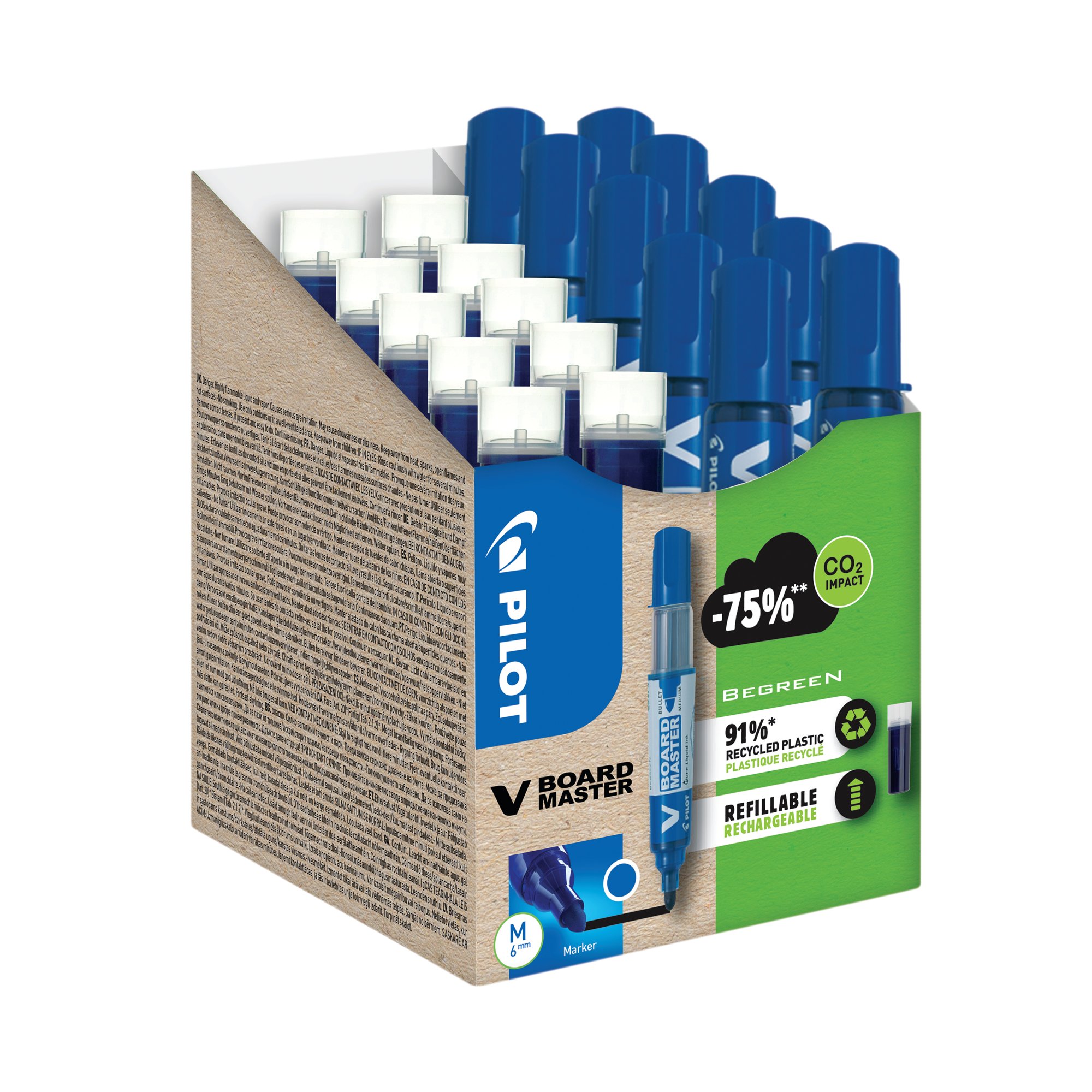 Pilot's V-Board Marker Pens are high quality bullet tip markers that do not compromise on quality. Containing no xylene or similar solvents, these low odour drywipe marker pens are perfect for the classroom and meeting rooms alike. The drywipe ink can be easily erased from all types of whiteboard surfaces using a cloth. To help you do your bit for the planet, these marker pens are refillable and made with 91% recycled material. This pack contains 10 drywipe markers and 10 refills.
