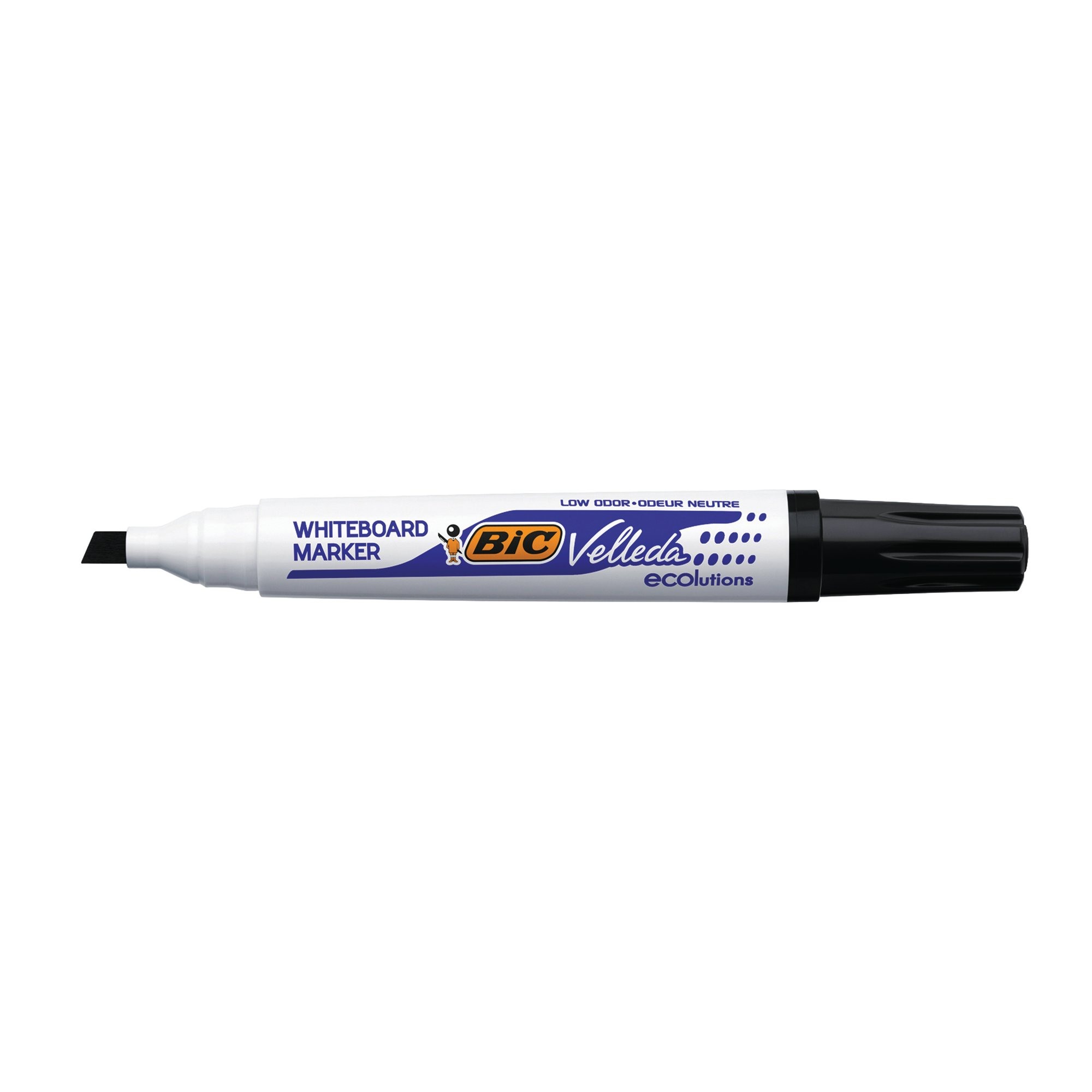 These Bic Velleda Whiteboard Markers feature ketone-based ink that glides on smoothly and erases just as easily, and is low odour to ensure comfort when writing extensively. It features a strong acrylic tip that will not bend or retract into the barrel, even with heavy use. The chisel tip delivers a variable line thickness between 3. 7mm to 5. 5mm, perfect sketching diagrams or creating bold titles.