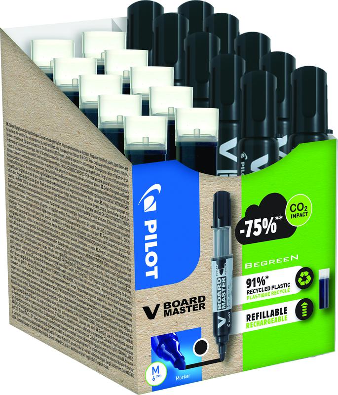 Pilot's V-Board Marker Pens are high quality bullet tip markers that do not compromise on quality. Containing no xylene or similar solvents, these low odour drywipe marker pens are perfect for the classroom and meeting rooms alike. The drywipe ink can be easily erased from all types of whiteboard surfaces using a cloth. To help you do your bit for the planet, these marker pens are refillable and made with 91% recycled material. This pack contains 10 drywipe markers and 10 refills.