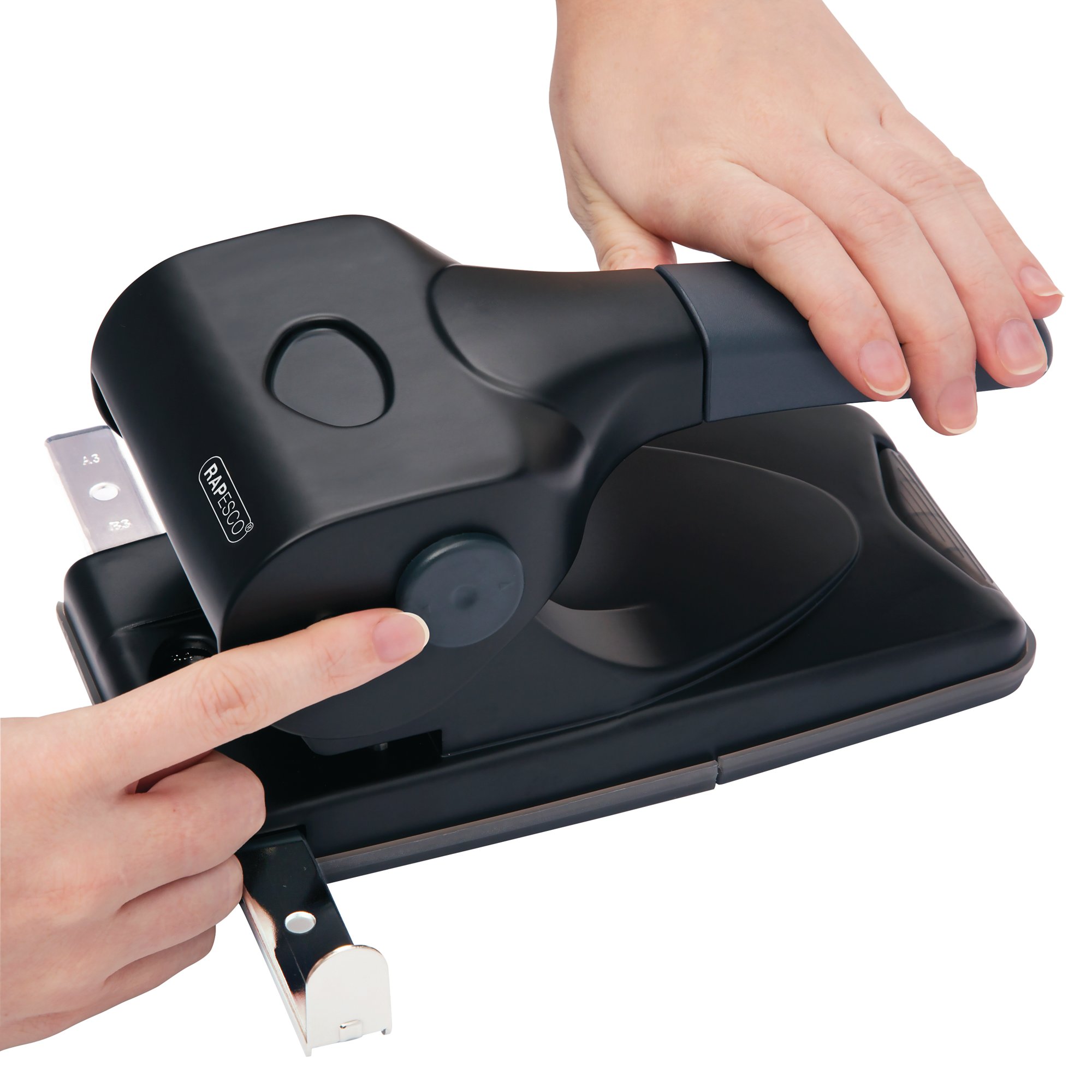 This heavy duty Rapesco ALU 65 hole punch features an aluminium alloy cast body with an extended, single piece handle with soft rubber grip for easily punching up to 65 sheets of 80gsm paper. The hole punch also features a personalisation window, adjustable metal paper guide, flip open confetti tray and a handle lock down switch for convenient storage. This pack contains 1 black hole punch.