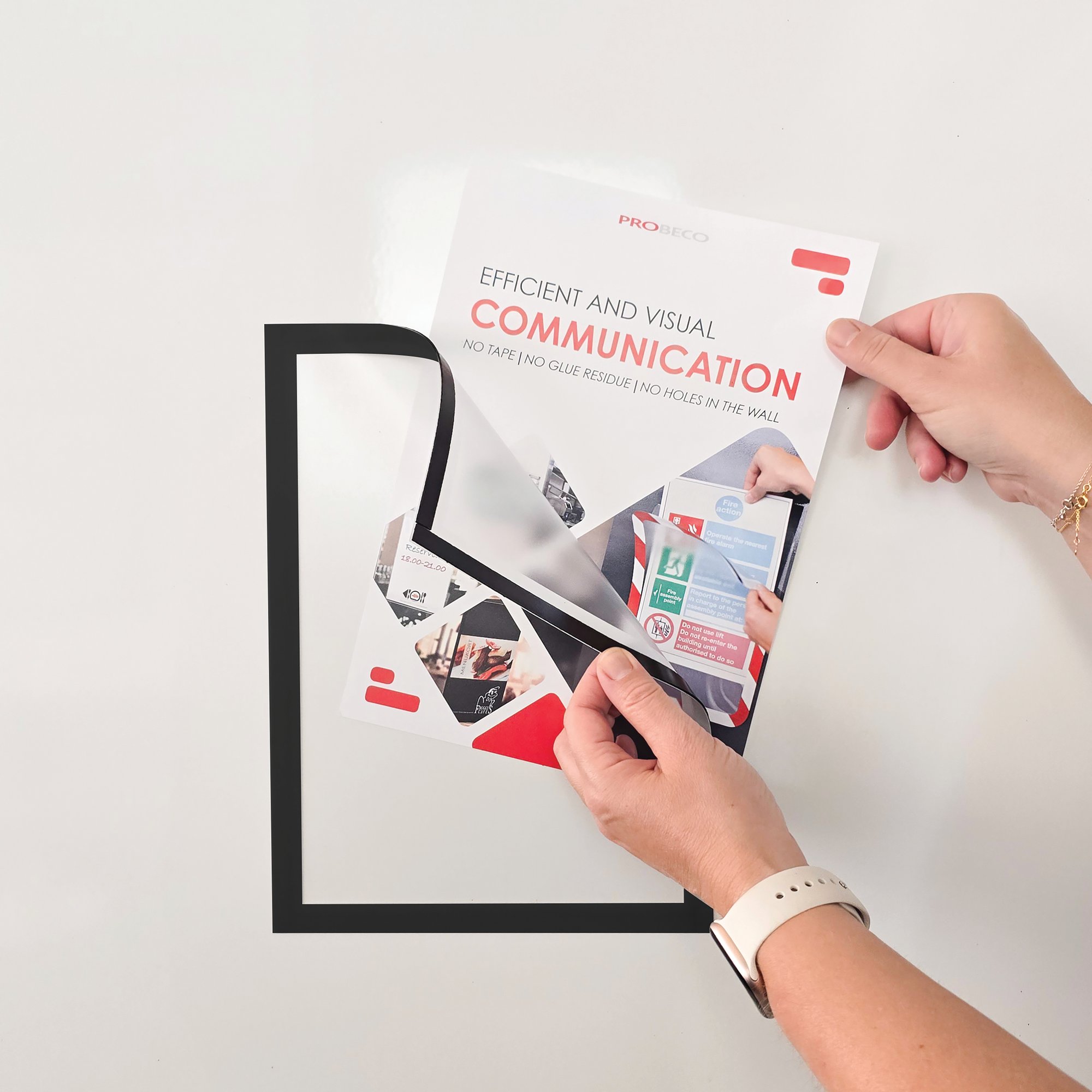 A3 magnetic stripped display frames that allow you that change information quickly and easily. Secures to the surface thanks to 4 magnetic strips on reverse. Swap out information in seconds with no fuss.