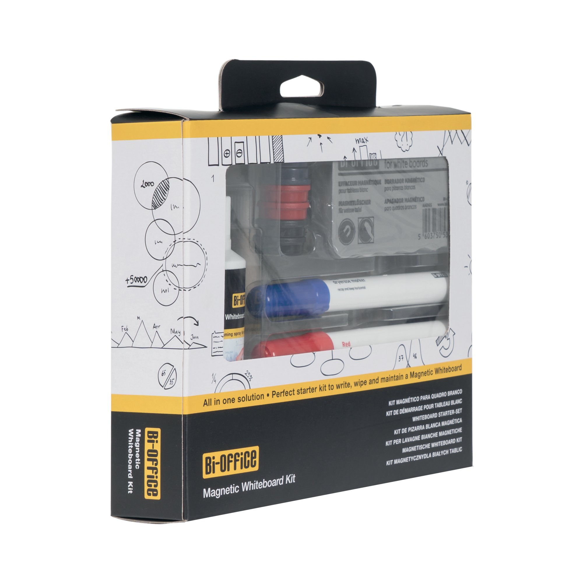 The Bi-Office Magnetic Whiteboard Kit is the best all-in-one solution for drywipe magnetic whiteboards. This set includes 4 drywipe bullet tip markers (black, red, blue, and green), 6 magnets (assorted colours), 1 lightweight magnetic eraser, and 1 cleaning spray (125ml). Display important items, write, draw, erase, and start all over again. Use this kit in your organising, planning, or monitoring activities, in the office or at home. Accessories like these allow you to use dry-erase magnetic whiteboards to their full potential.