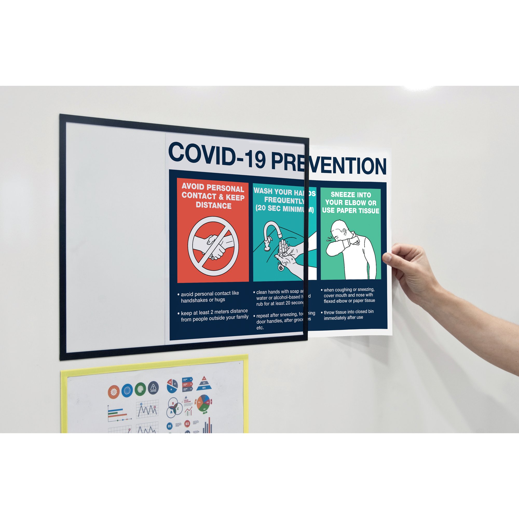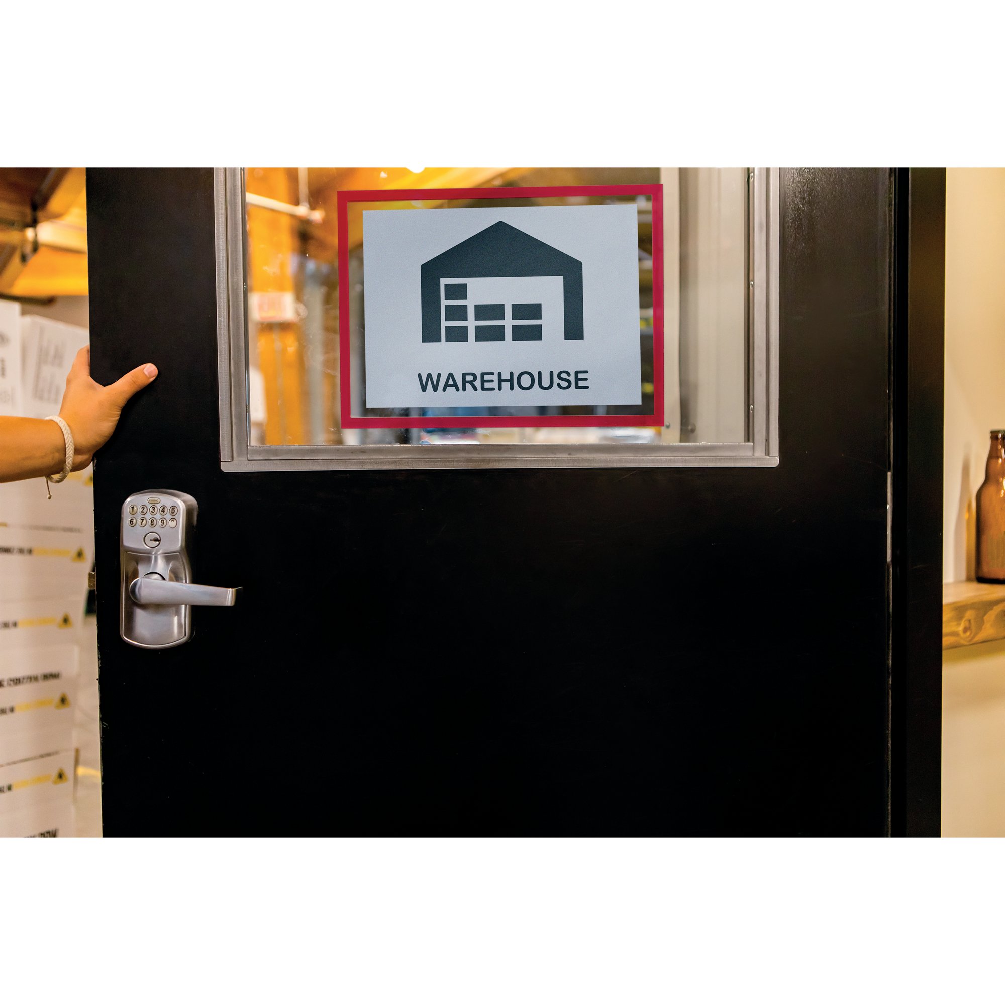Bi-Office Adhesive Document Holder is a simple and easy way of displaying documents like charts, warning signs, and general information. Highlight the documents importance and increase the overall perception with the coloured frame. Access and update the sheets whenever necessary due to one open side. The transparent plastic cover protects from hampering and dust while enabling a clear view of the content. It comes in an A3 or A4 formats with three adhesive sides to help keep your information in perfect position. Available in 6 different colours to match your workspace style, each pack contains 5 units.