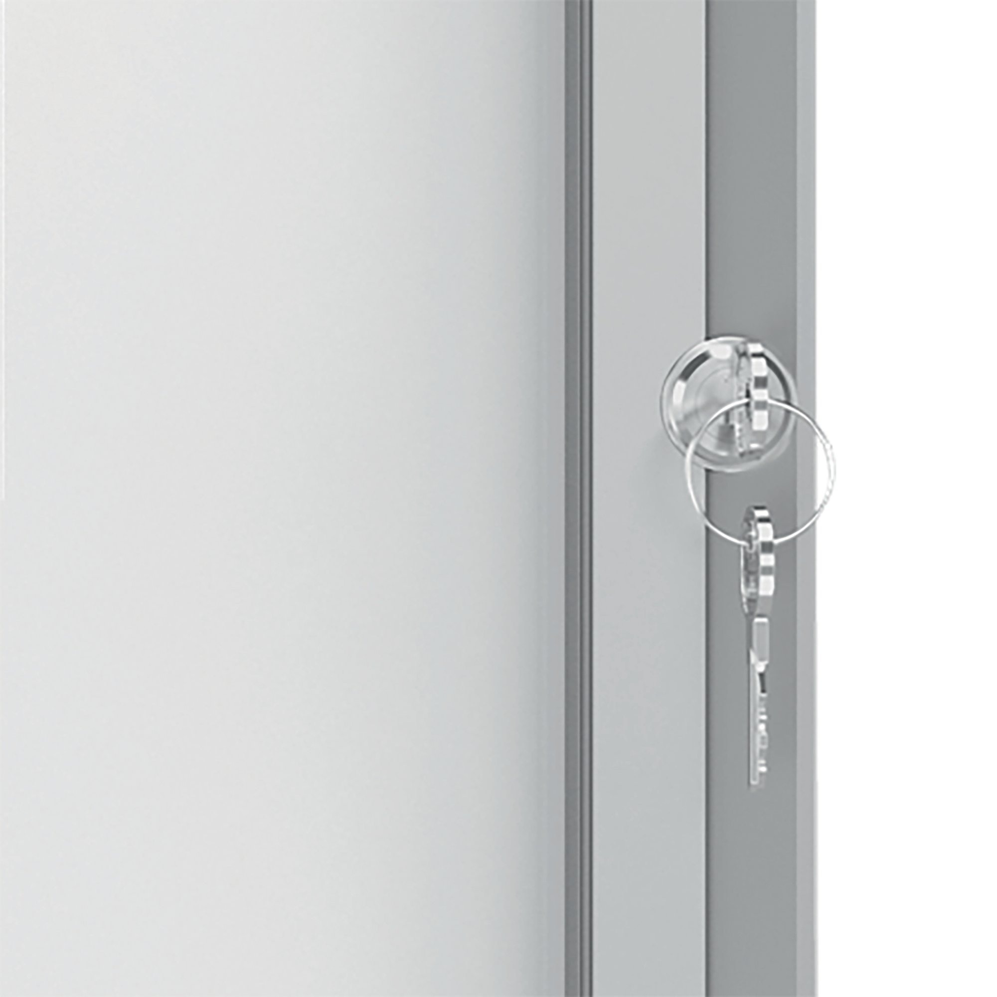 Magnetic outdoor weatherproof lockable notice board with a hinged glass door and side lock. Complete with a modern stylish aluminum trim and fixed with a through corner wall mounting. Excellent magnetic notice board surface to securely display your notices.