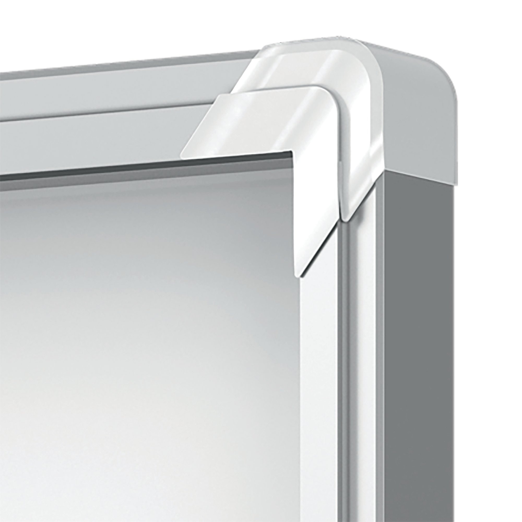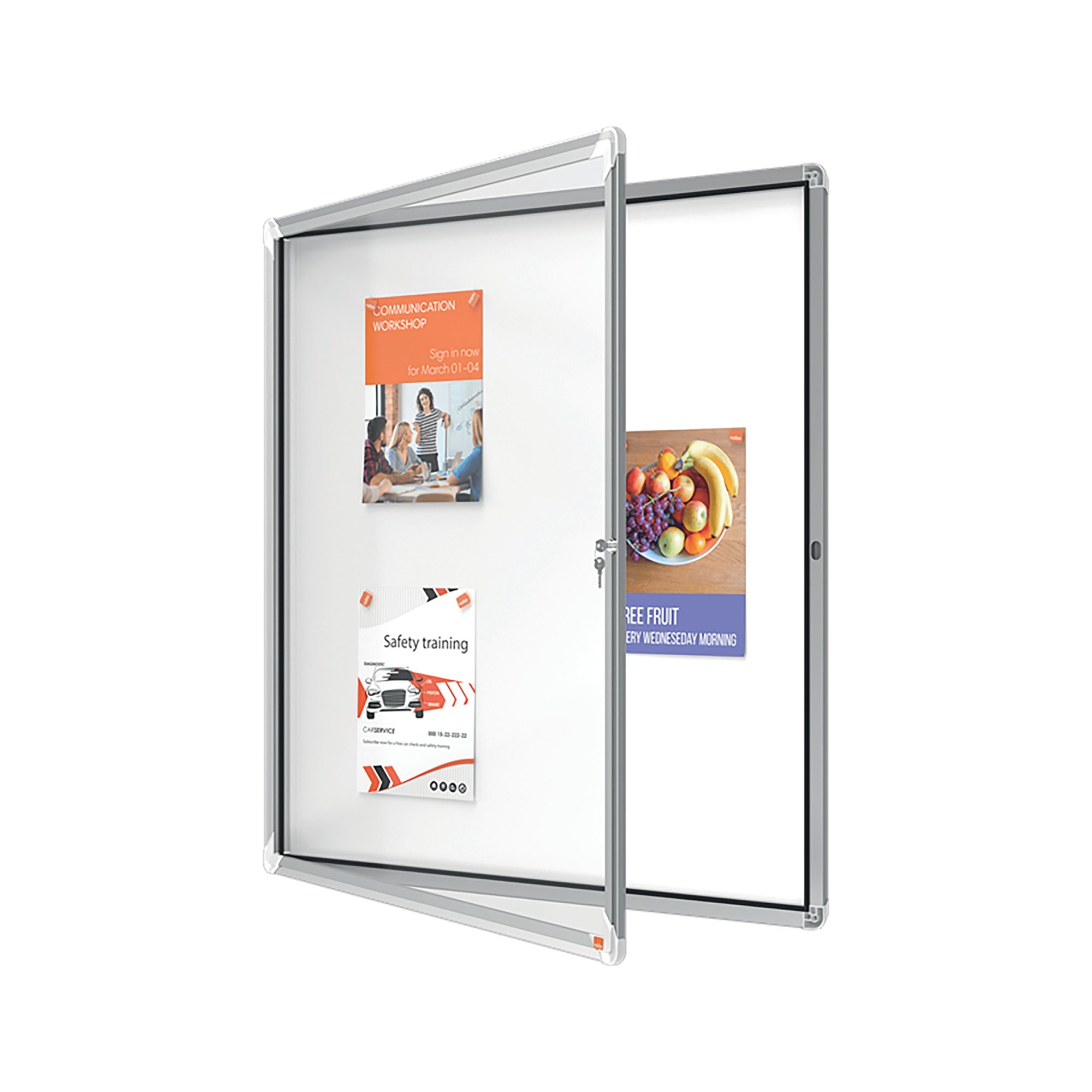 Magnetic outdoor weatherproof lockable notice board with a hinged glass door and side lock. Complete with a modern stylish aluminum trim and fixed with a through corner wall mounting. Excellent magnetic notice board surface to securely display your notices.