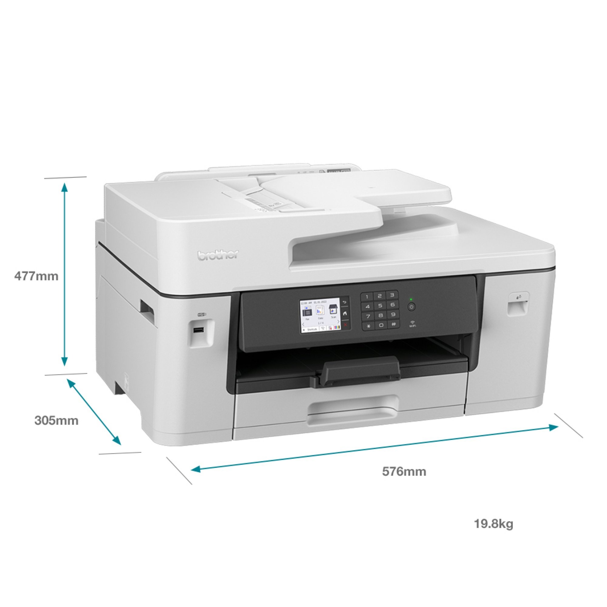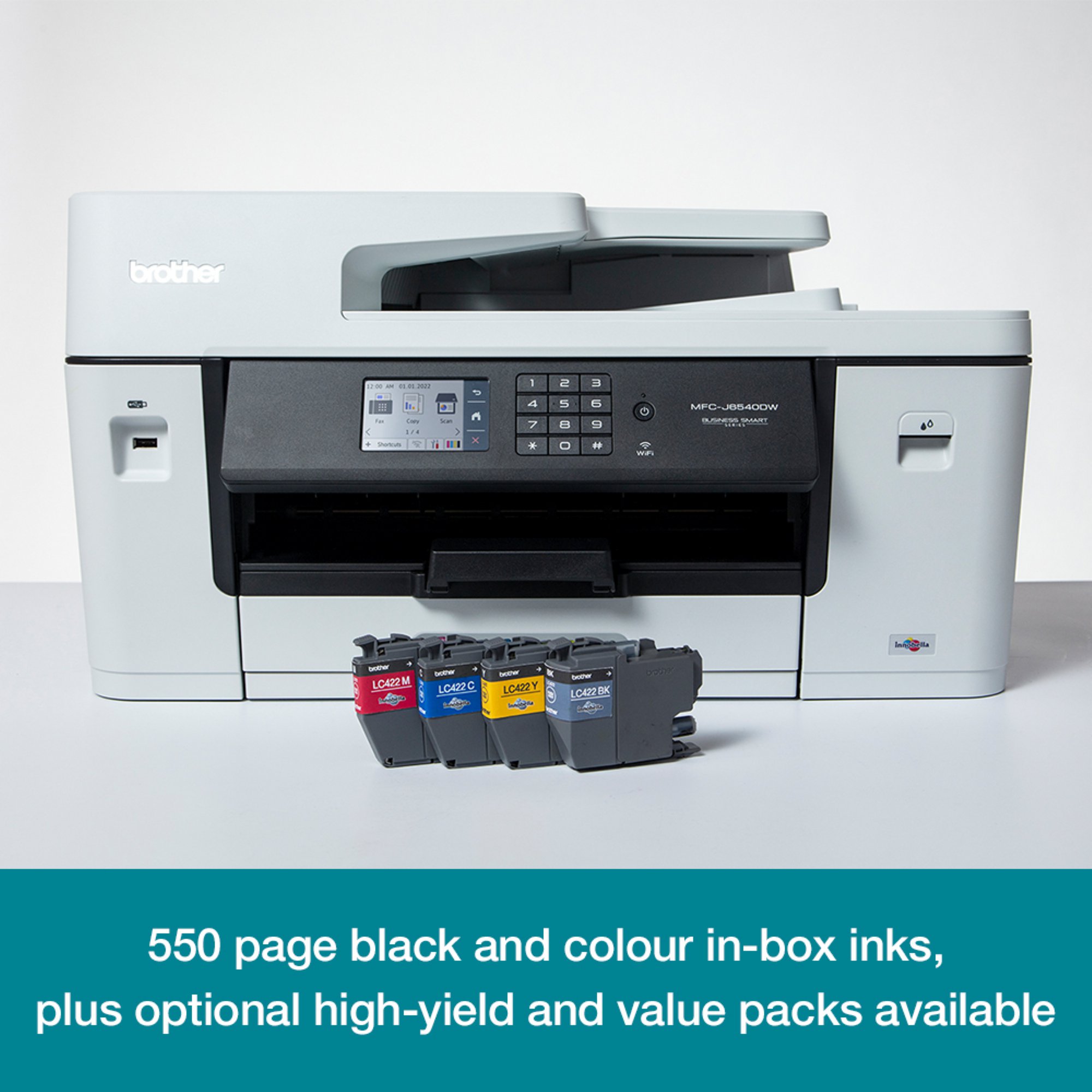 The Brother A3 MFC-J6540DW All-in-One inkjet printer has wireless and wired connectivity, ideal for the modern small office and business workgroups. With mobile connectivity via Brother Mobile Connect app, Apple Airprint, Brother Print Service Plugin, Mopria. Easy to navigate through the functionality via the 68mm colour touchscreen LCD control panel. Supplied with LC422 cartridges (CMYK) (550 pages per cartridge).
