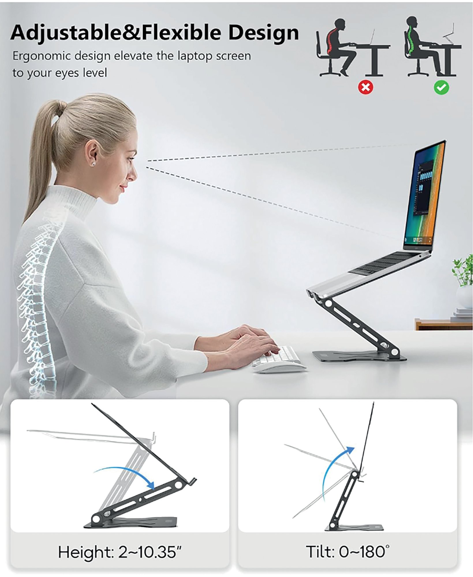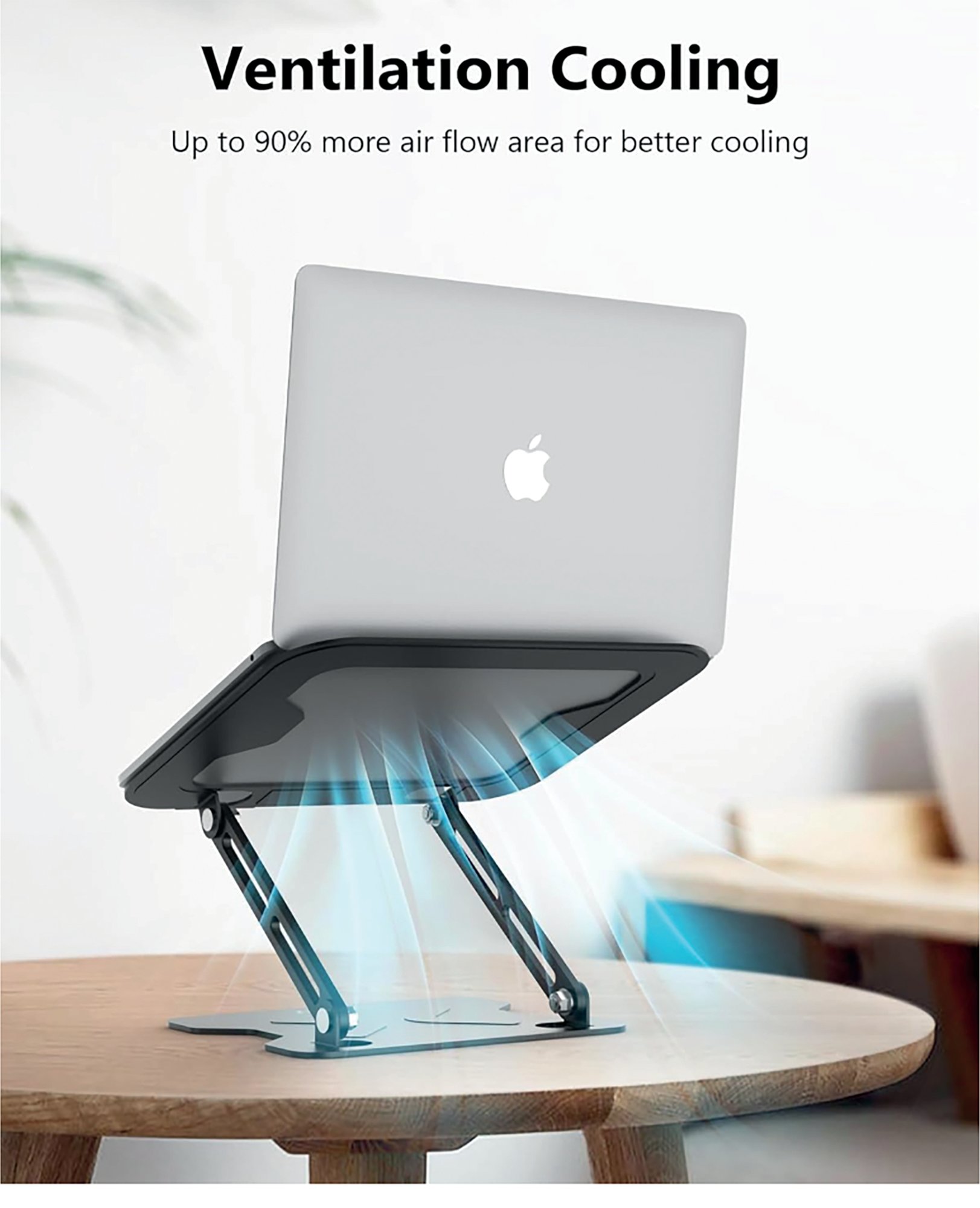 Folding adjustable height metal laptop stand with open vented (iron) platform suitable for laptops up to 17 inch in black