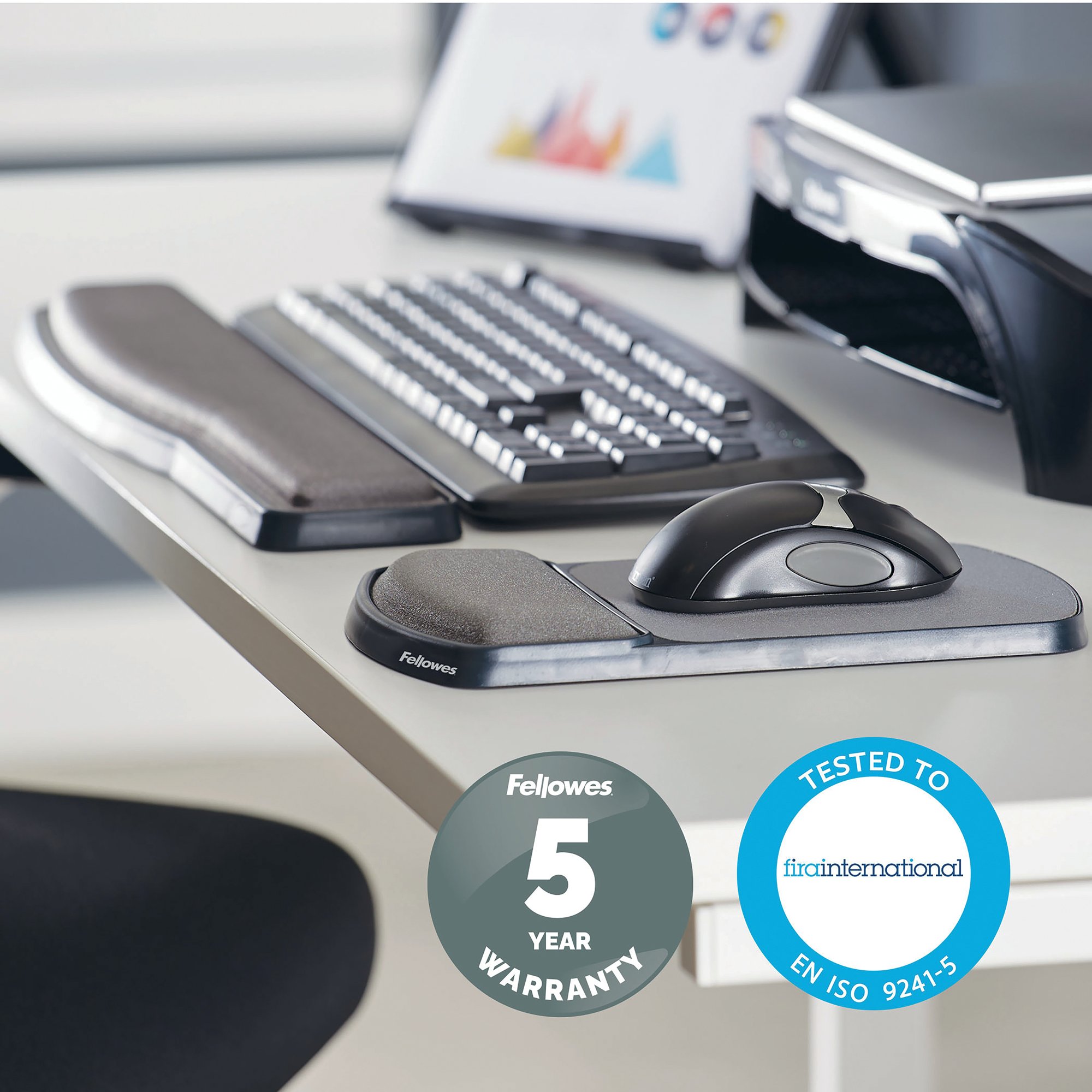 This innovative Fellowes Premium Gel Mouse Pad features a wrist support that is height adjustable to 2 different positions with a tilt option to help provide support to a variety of users. The mouse pad also features soothing gel with a soft touch polyester cover and a non-slip backing. This pack contains 1 black mouse pad.