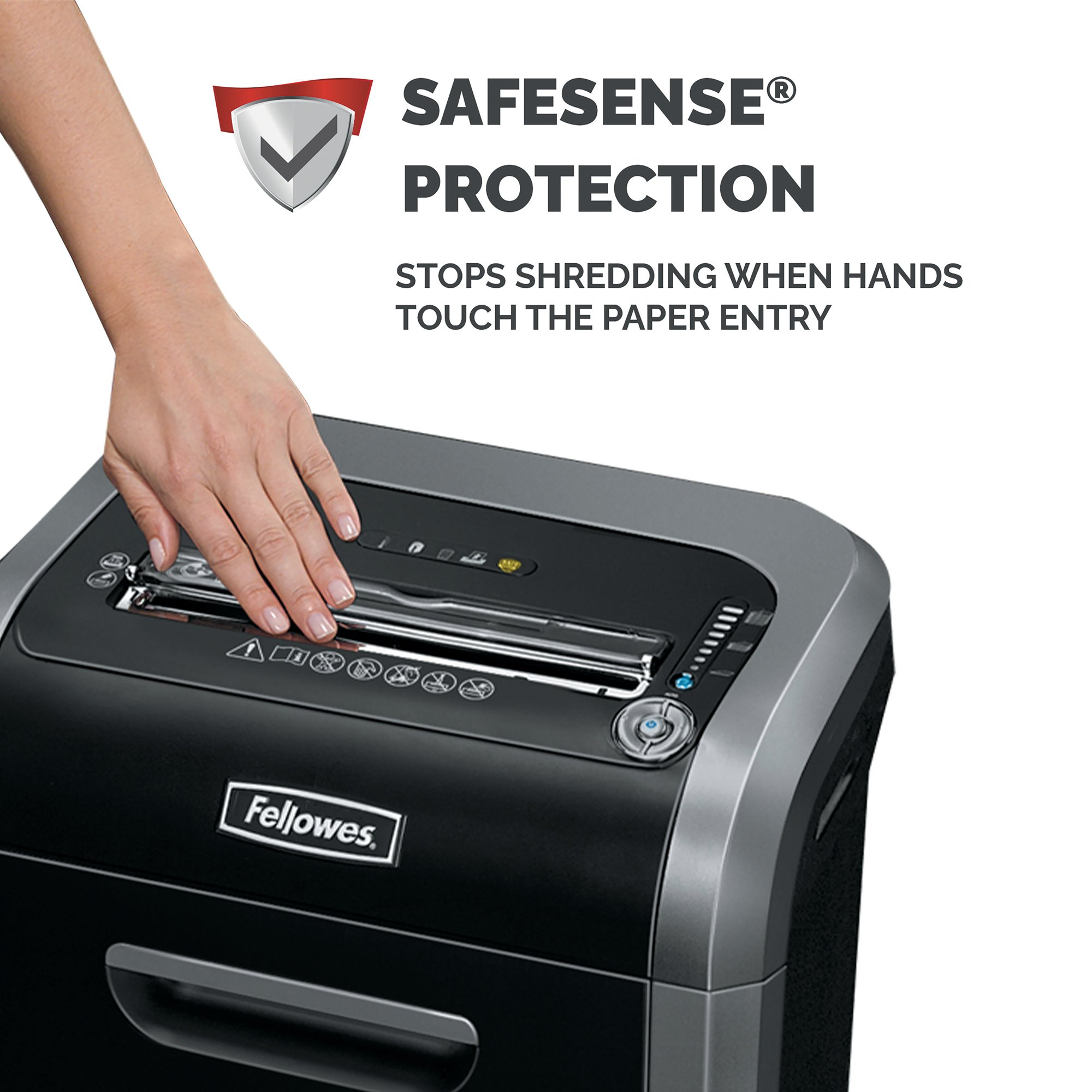 - Patented SafeSense Technology stops shredding when hands touch the paper opening