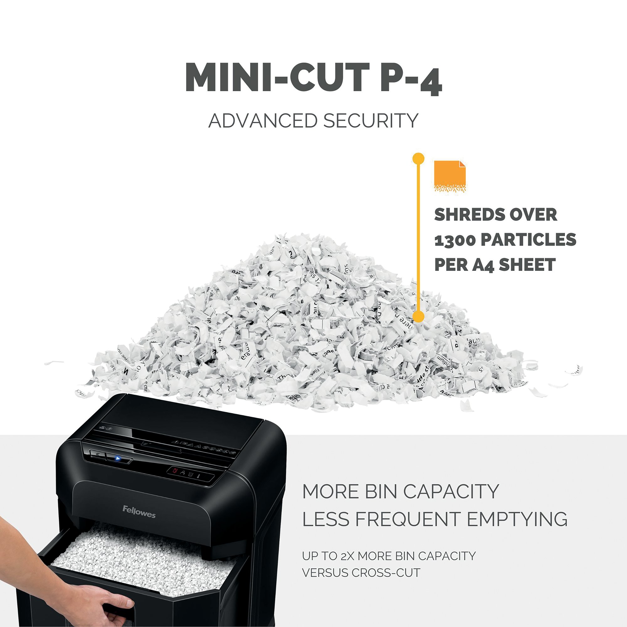 This Fellowes AutoMax 80M hybrid shredder provides effective document destruction with either single sheet automatic feeding or standard manual feeding. With a P-4 security level, the mini-cut shredder shreds into 4x12mm particles, which is up to 3x smaller than standard cross cut shredders. The shredder has a 80 sheet automatic and a 8 sheet manual shredding capacity (70gsm) with a 7 minute run time. The shredder also includes a 17 litre pull out bin for easy emptying.