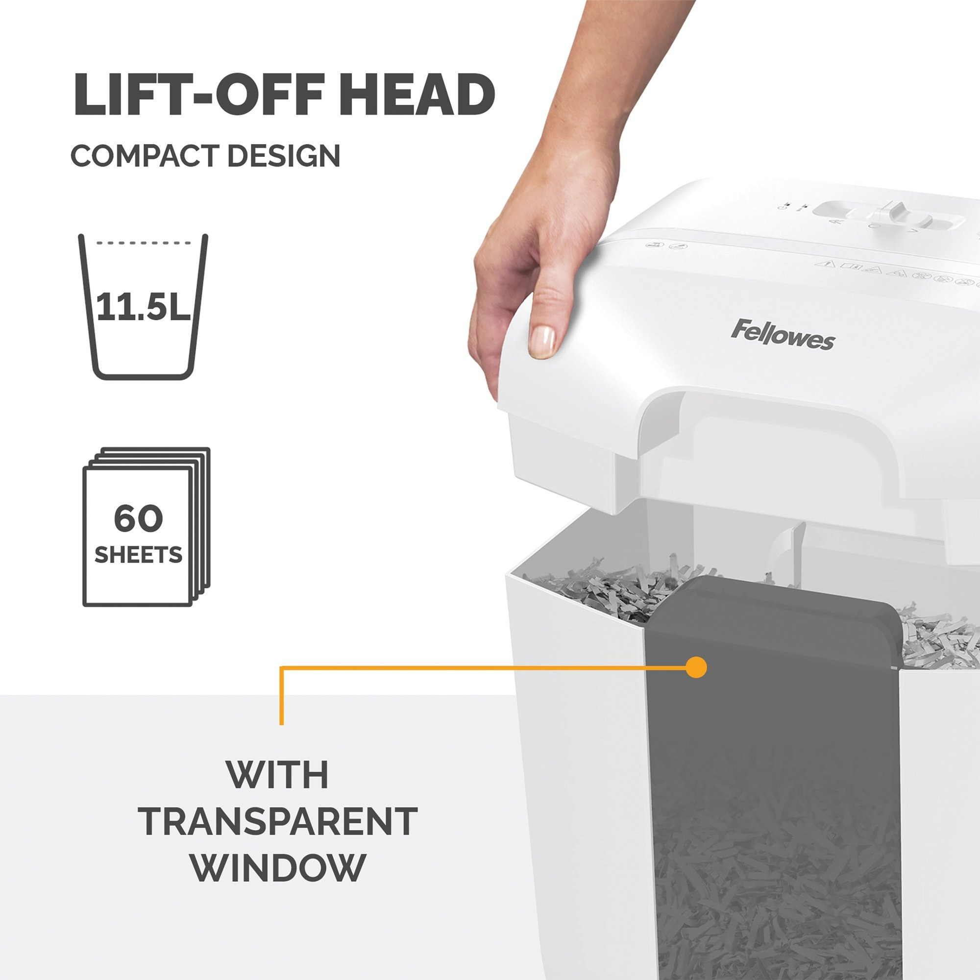 - 11.5 litre bin with a handy viewing window, simply lift off the head of the shredder and remove the waste