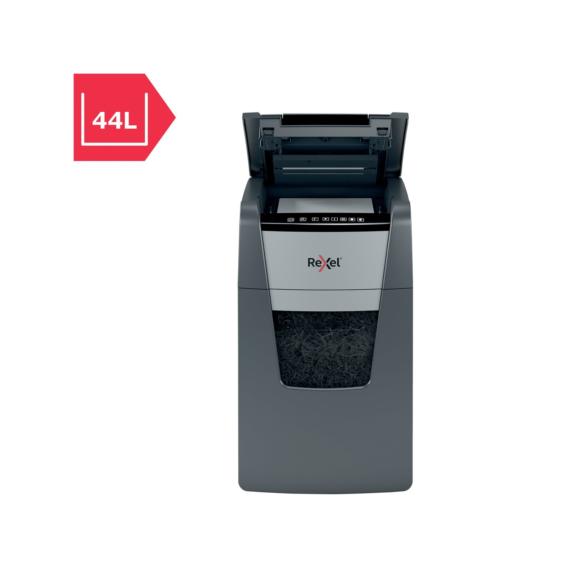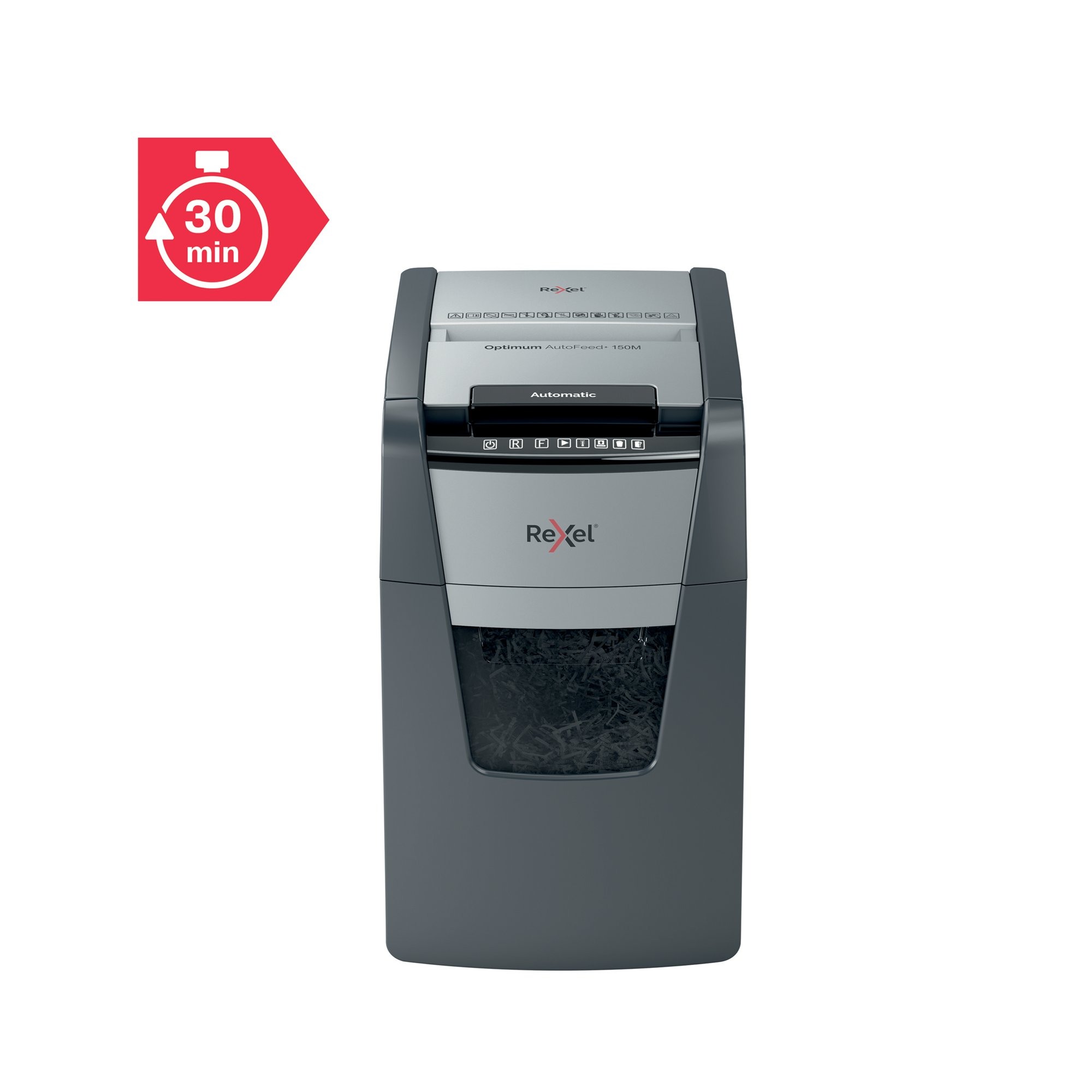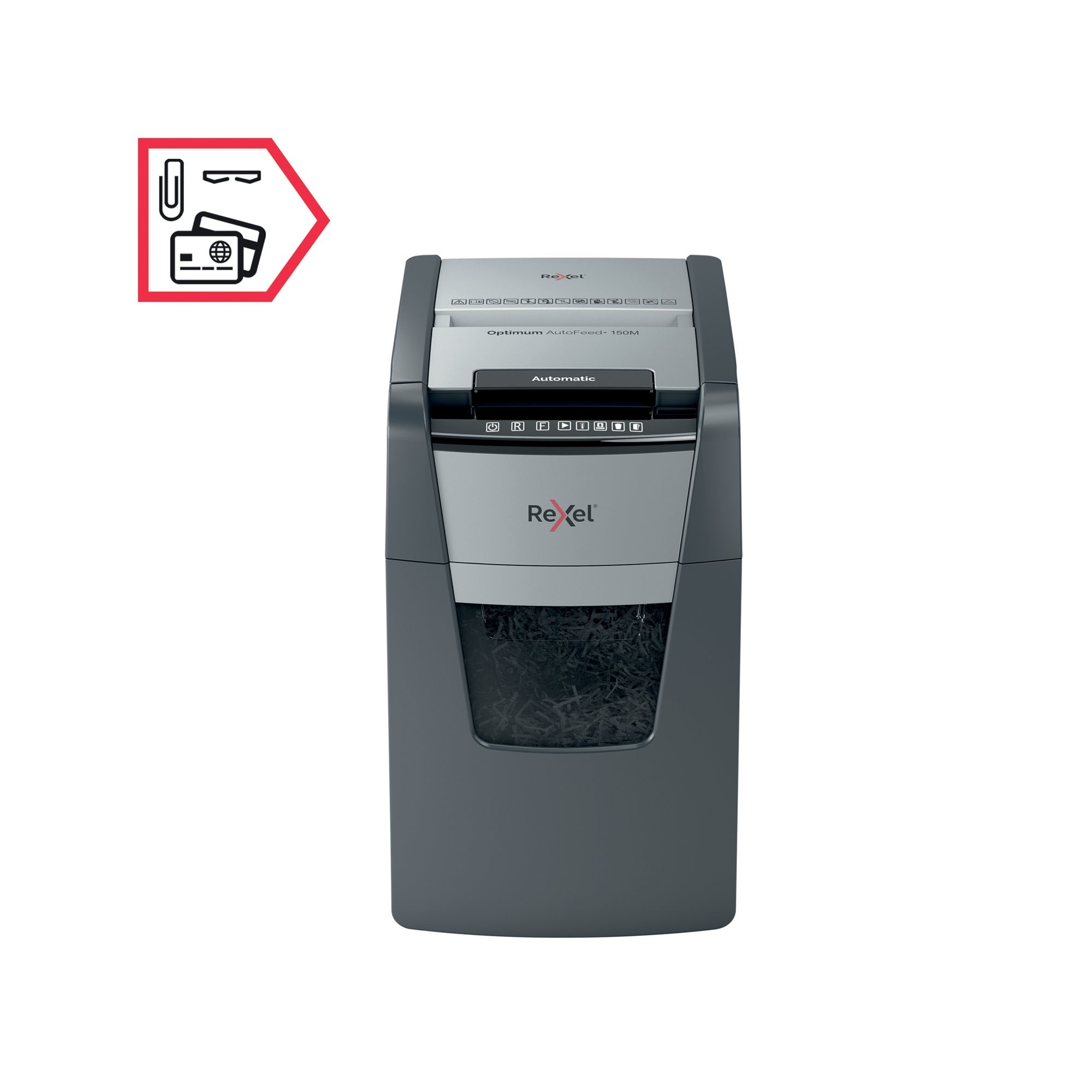 Rexel Optimum AutoFeed+ 150M Micro-Cut shredder automatically shreds up to 150x A4 sheets of paper (80gsm) at a time, into P-5 (2x15mm) micro-cut pieces. This auto feed shredder machine is a sophisticated office shredder, featuring a 44L pull out bin. The auto-feed removes the need to manually feed paper, and with the capability to accept staples and paper clips, the tedious process of manual removal is also unnecessary.