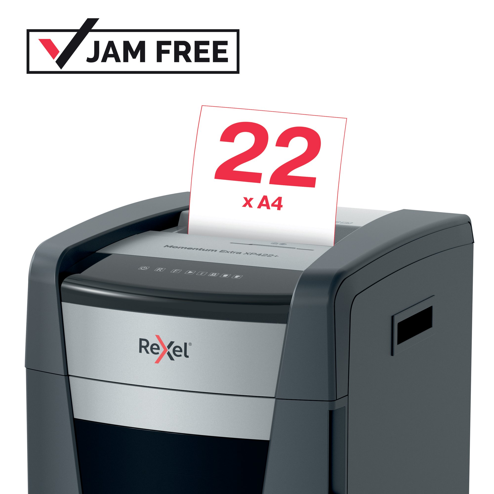 Rexel Momentum Extra jam free paper shredders are ideal for destroying confidential documents in the office. The XP422+ shredder machine shreds up to 22 sheets of A4 paper (80gsm) in one go through the manual feed slot into P-4 (4x40mm) cross-cut pieces. Active sensing technology measures the number of sheets being fed in real-time to stop paper jams and misfeeds; indicated by a red LED on the control panel. This paper shredder will not operate until the number of sheets is reduced below or at the maximum sheet capacity. This cross-cut shredder is designed for moderate to heavy use with its high sheet capacity, large 85L bin size and continuous run time. There's no need to manually feed paper, or remove staples and paper clips first; this Rexel shredder also safely shreds CDs, DVDs and credit cards through a separate feed slot.