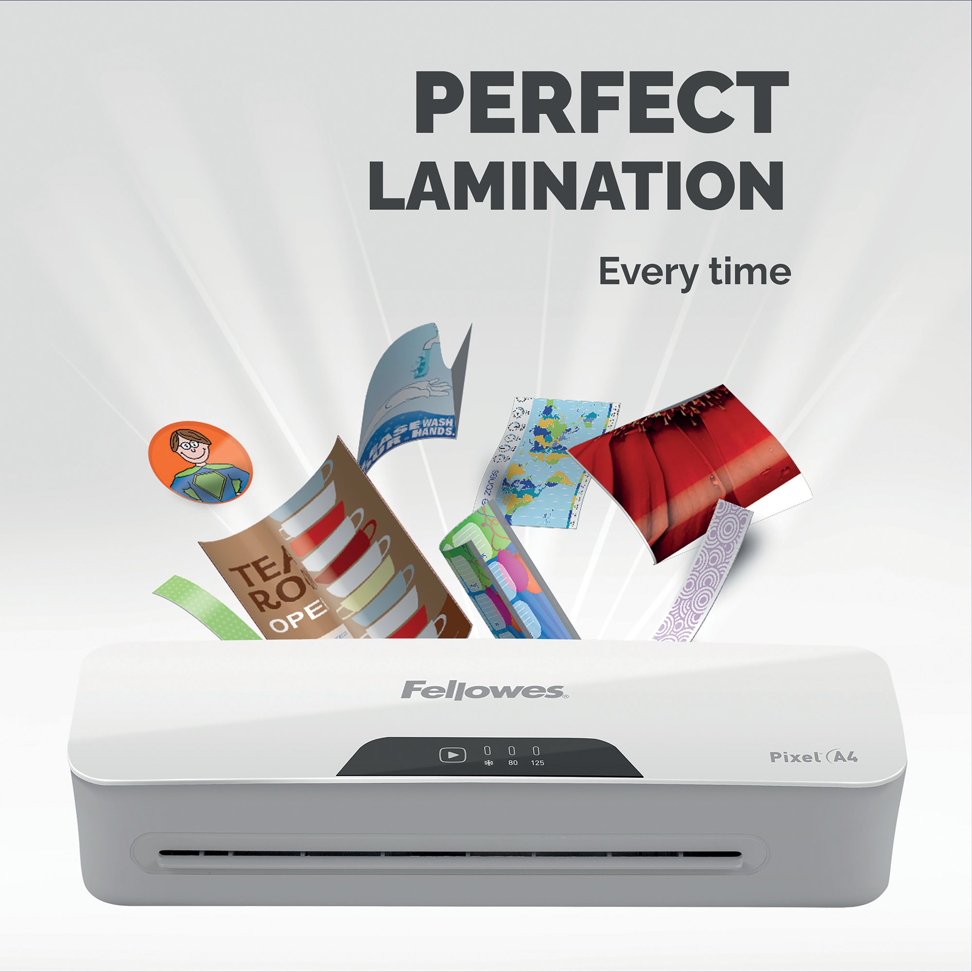 A sleek and stylish laminator from Fellowes, the Pixel A4 laminator is an incredibly versatile and easy to use machine, perfect for use at home or in smaller offices. Boasting an exceptionally fast heat-up time of as little as 3 minutes, the Pixel is capable of laminating in 80 or 125 micron thickness allowing it to perfectly suit your needs. With a host of other user-friendly features, such as an automatic shutdown after 30 minutes of inactivity for increased energy efficiency and a release trigger for easily retrieving and realigning misfed documents, the Pixel A4 laminator is both highly efficient and practical.