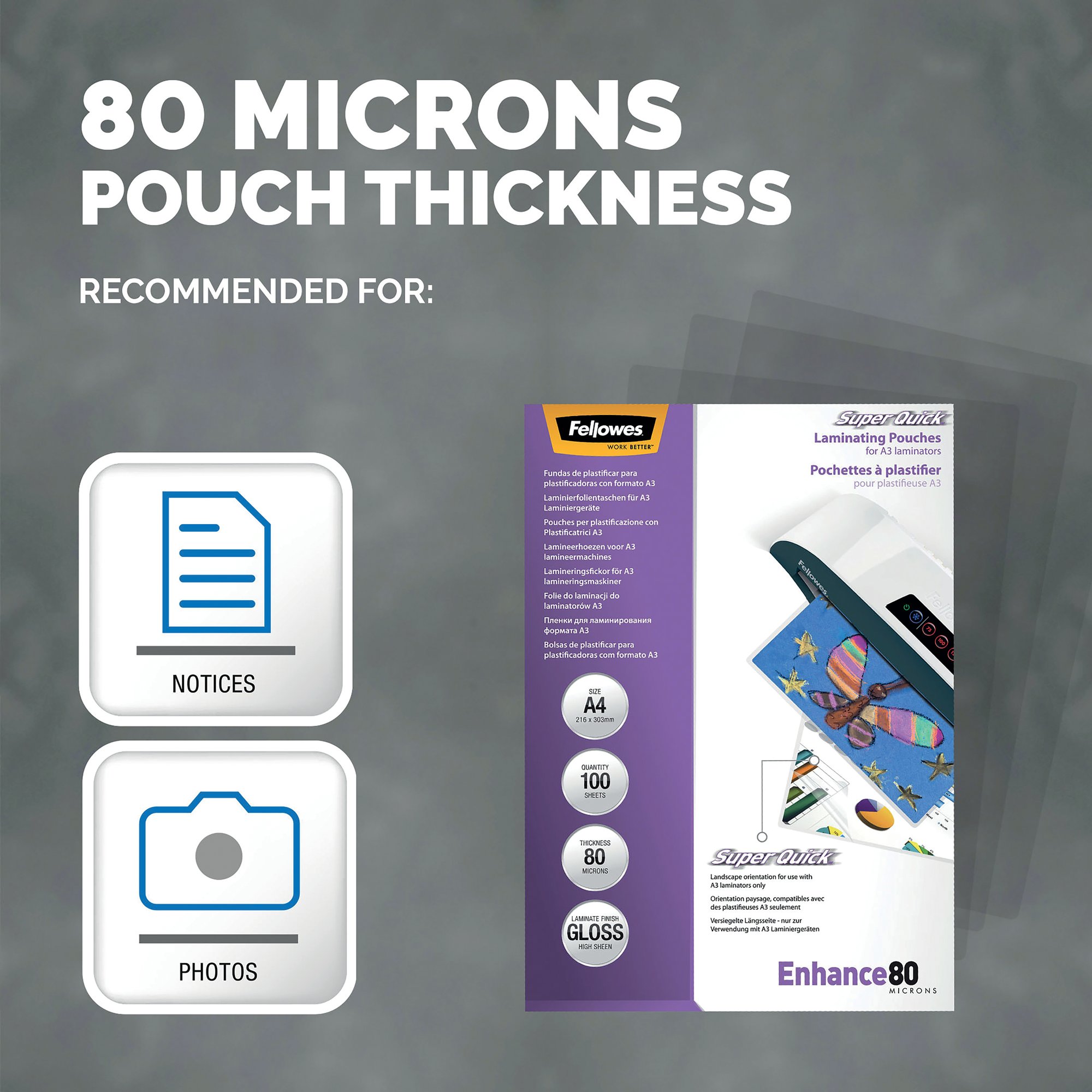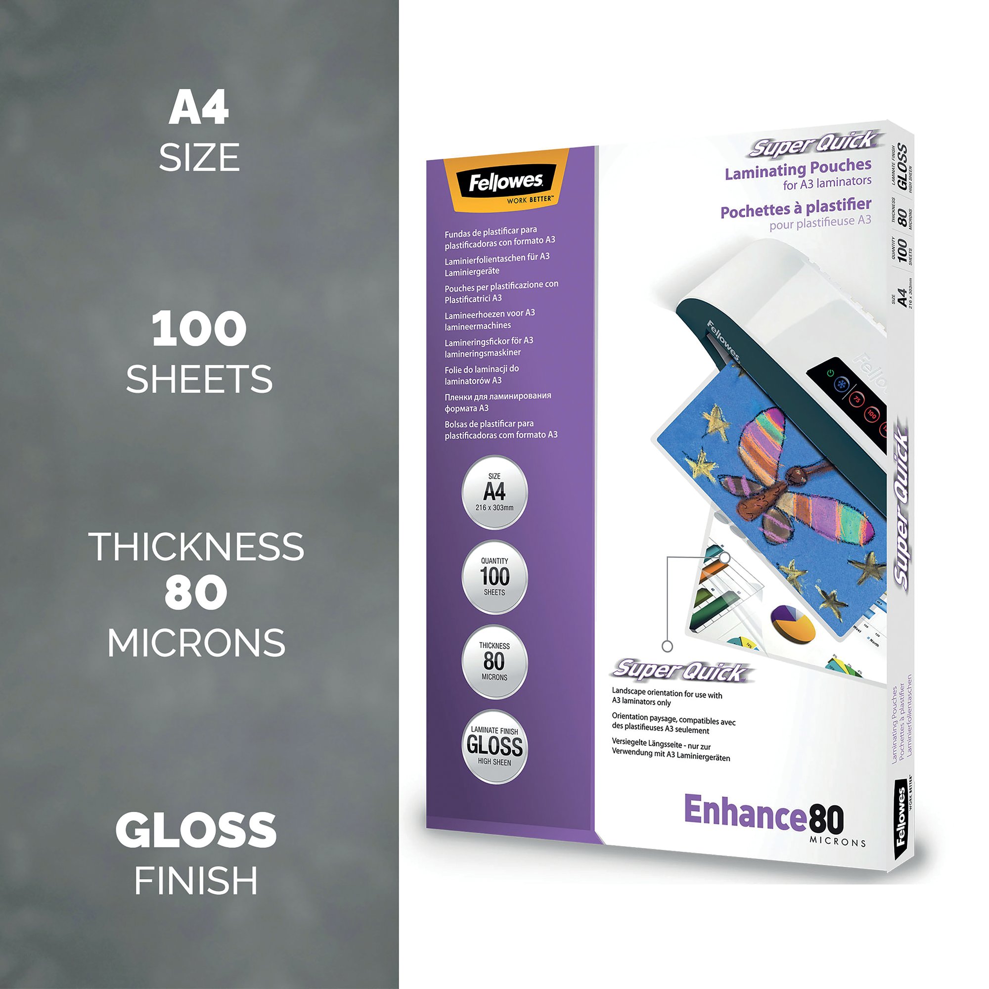These ultra-lightweight, 160 micron laminating pouches are designed specifically for Super Quick laminating. Ideal for businesses with a large amount of laminating tasks on a daily basis, these pouches help speed up your operation and increase efficiency. Each pouch provides protection for posters, notices and general documentation. Ideal for keeping documents clean, pristine and professional looking. This pack includes 100 A4 pouches.