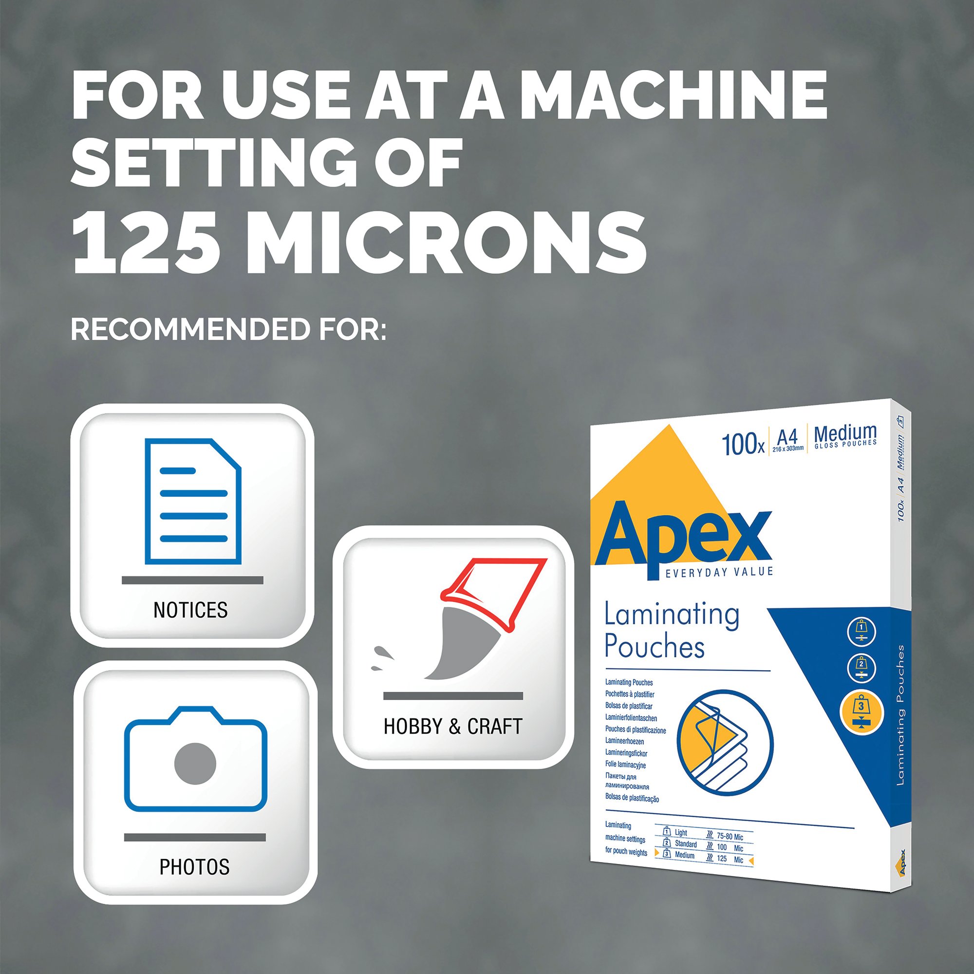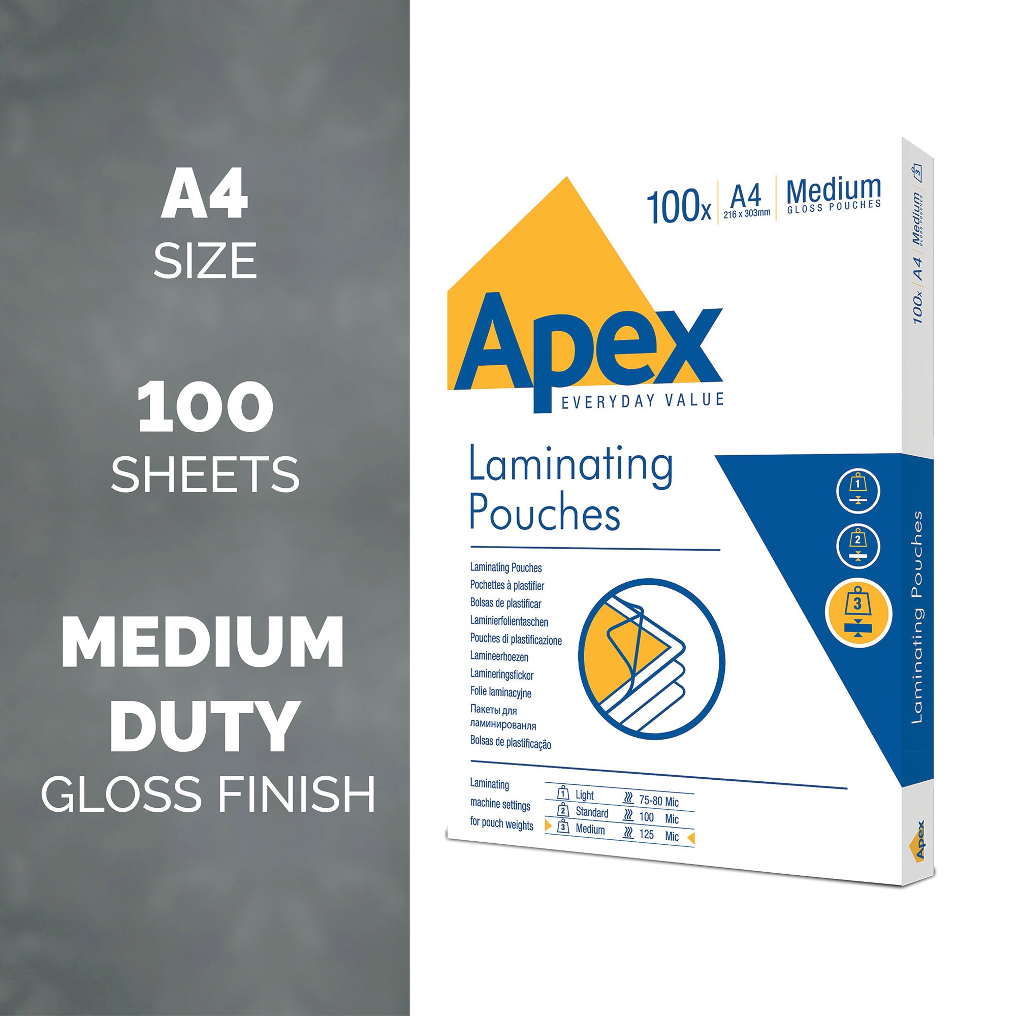 Fellowes Apex Laminating Pouches are the affordable choice for quality laminating pouches for your laminator. Use these pouches to protect documents, notices, posters and more under a tough but clear layer of plastic. Designed for medium duty laminating of A4 documents, this pack includes 100 pouches.