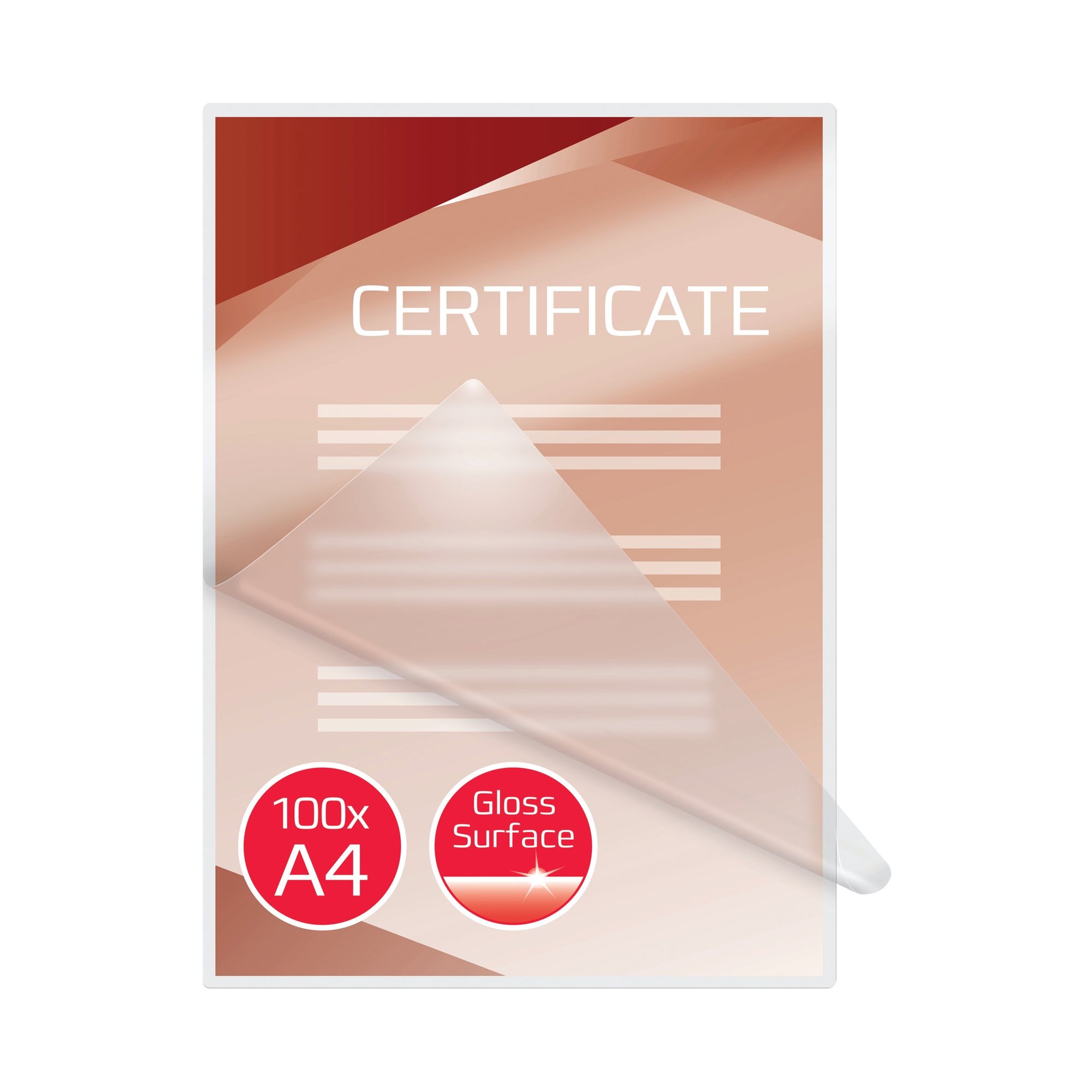 Laminating pouches are a convenient, everyday solution to protect and enhance valuable presentation pages, reference lists, product sheets, notices, photographs and certificates. 250 Micron Gloss. A4 format. Pack size:100.