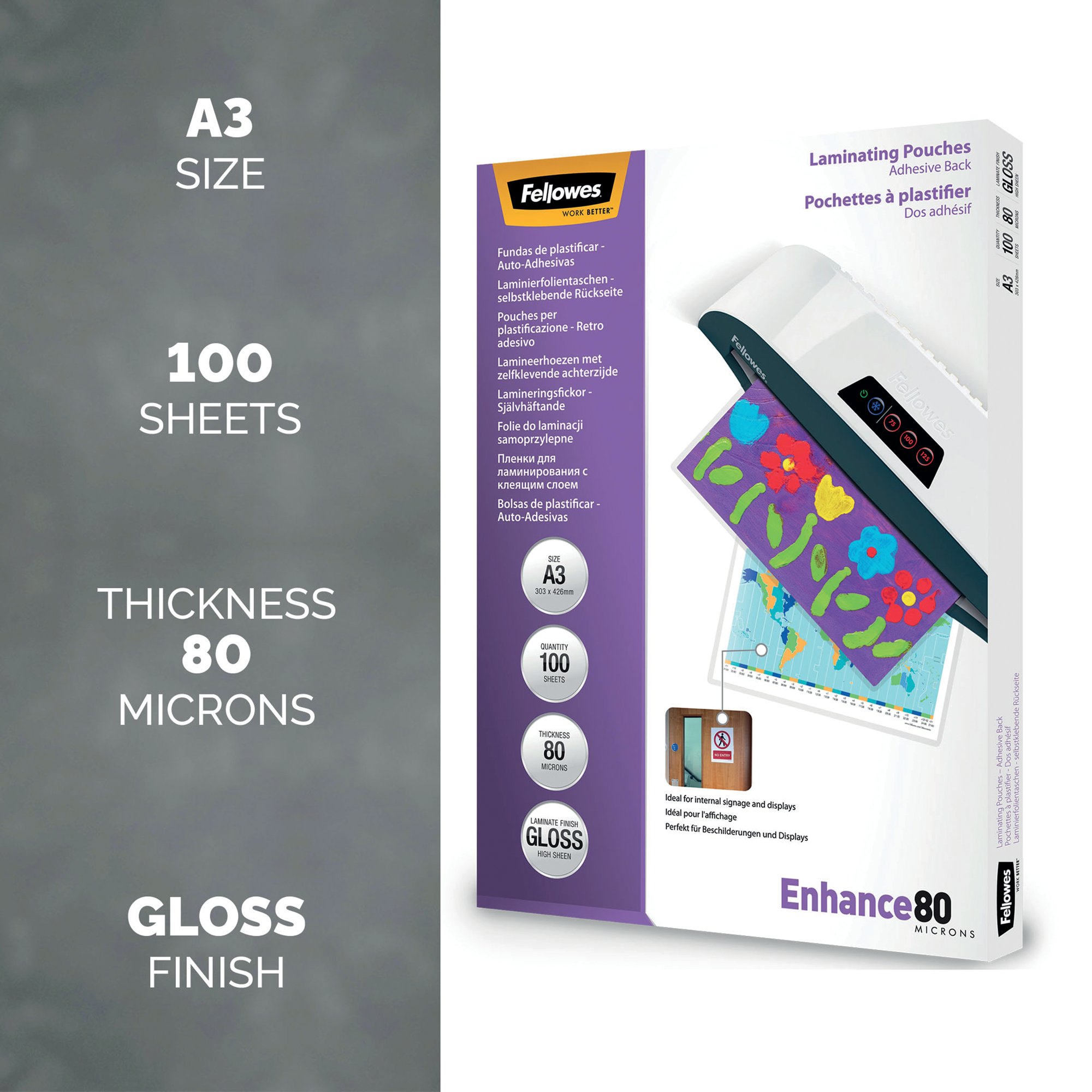 Fellowes Enhance80 Self Adhesive Laminating Pouch A3 160 Micron Total Gloss (Pack of 100) 5302302Up one level