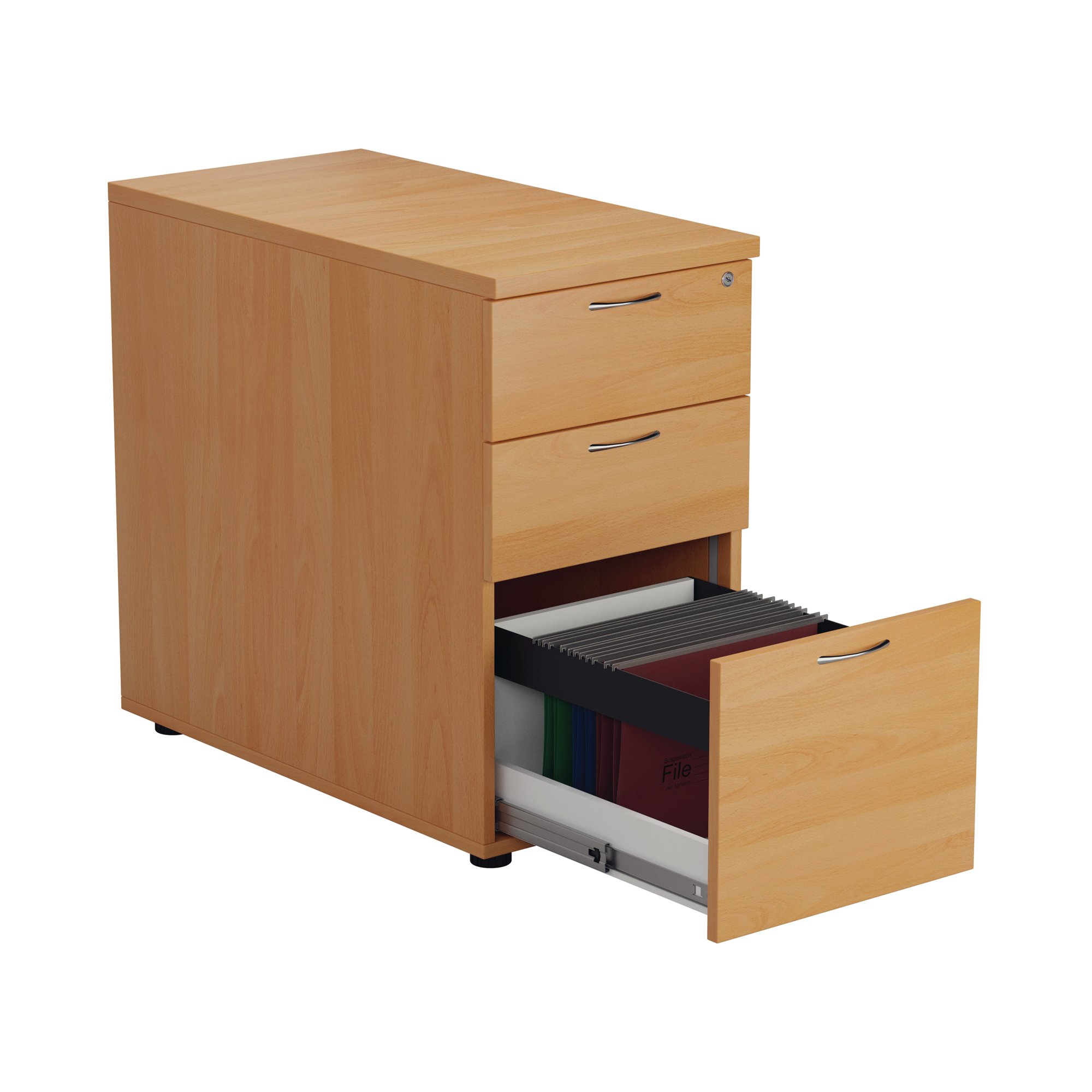 Suitable for use with standard desks, 600mm/800mm deep desking and radial desks, this 3 drawer desk high pedestal includes 2 box drawers and 1 foolscap size filing drawer. The box drawers will take A4 files. Measuring W404 x D800 x H730mm with a 25mm desktop the pedestal is finished in Beech.