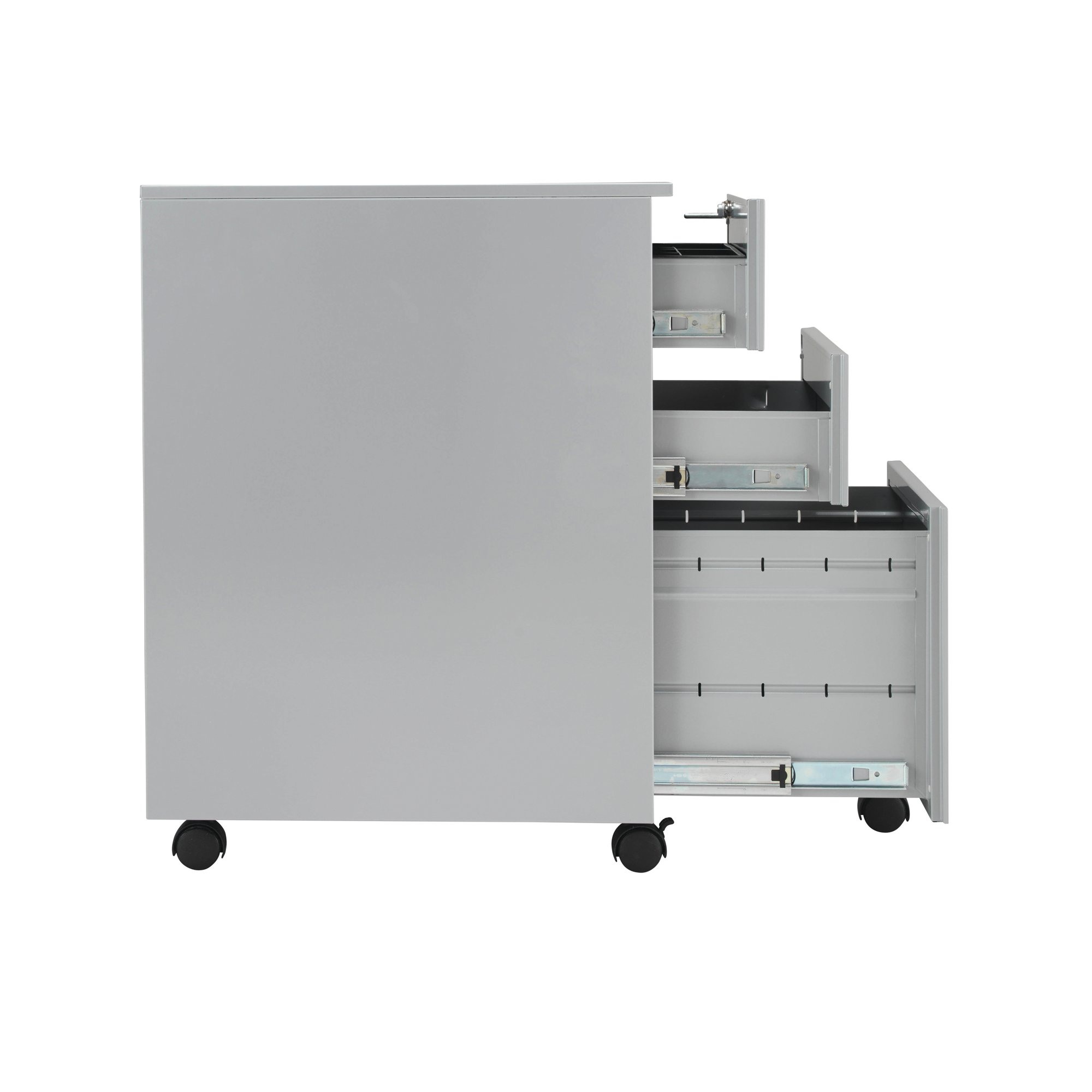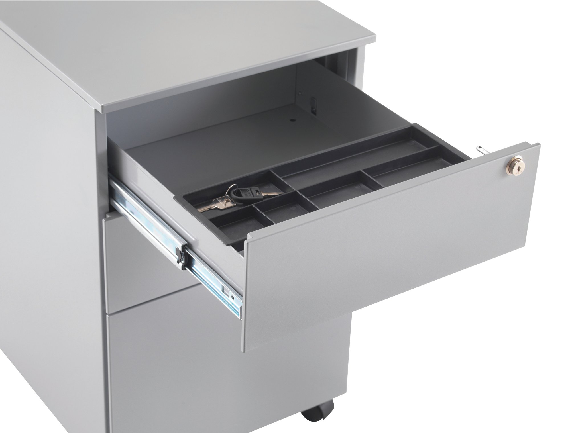 This entry level Jemini mobile steel pedestal features 2 stationery drawers and 1 filing drawer suitable for use with A4 suspension files. The tough steel carcass features an anti-tilt mechanism, allowing only 1 drawer open at a time. This pedestal measures W380xD470xH615mm and comes in a silver finish with an integrated handle design.