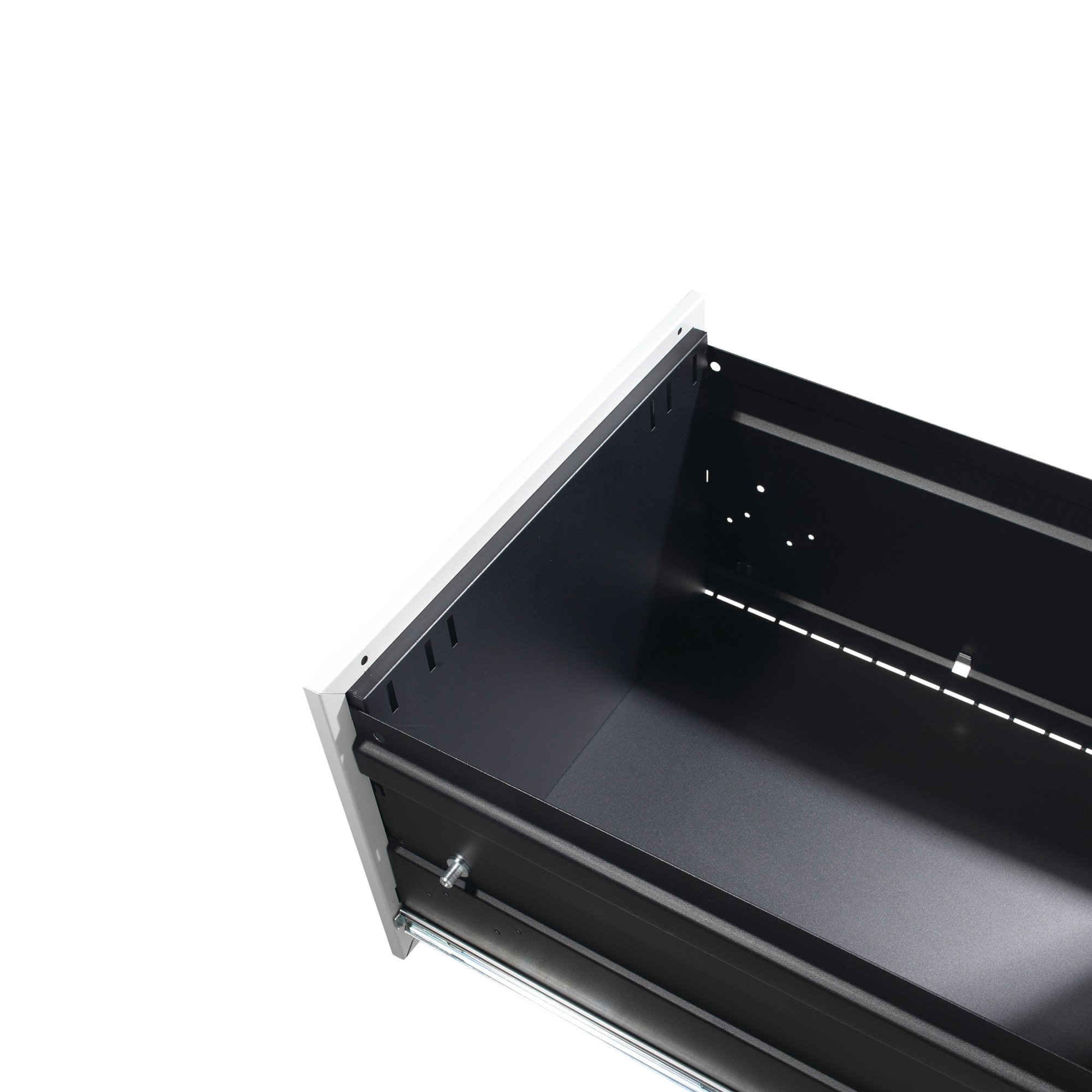 This entry level Jemini mobile steel pedestal features a slimline design for offices with space-saving needs. With 2 stationery drawers and 1 filing drawer, this pedestal is suitable for use with A4 suspension files. The tough steel carcass features an anti-tilt mechanism, allowing only 1 drawer open at a time. This pedestal measures W300xD470xH615mm and comes in white with an integrated handle design.