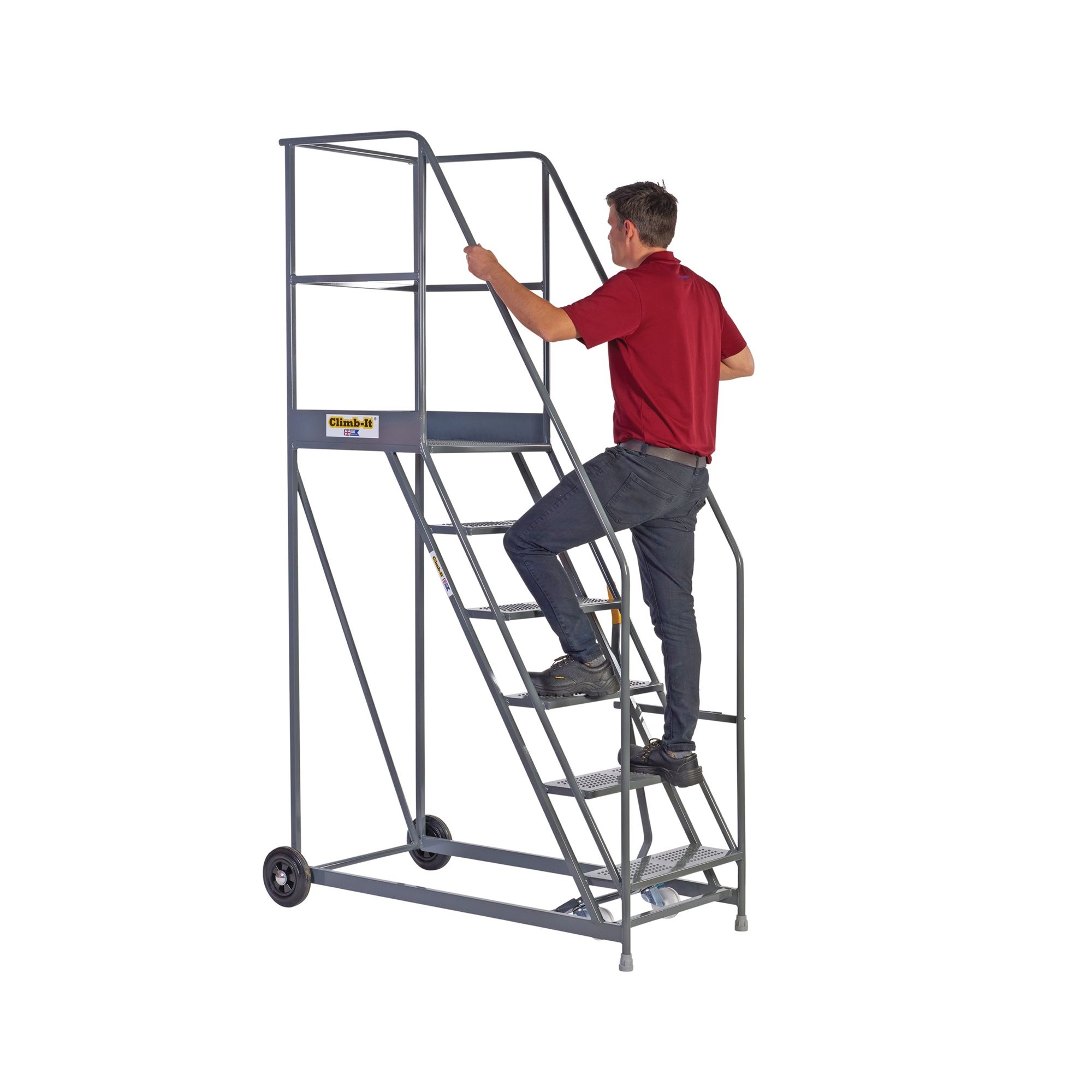 These Climb-It Warehouse Safety Steps have wide profile treads and a box section base for extra strength and security. A hand lock mechanism engages or disengages the front castors so the steps are mobile or static. Non-slip punched treads and platform. Maximum load capacity of up to 150kg.