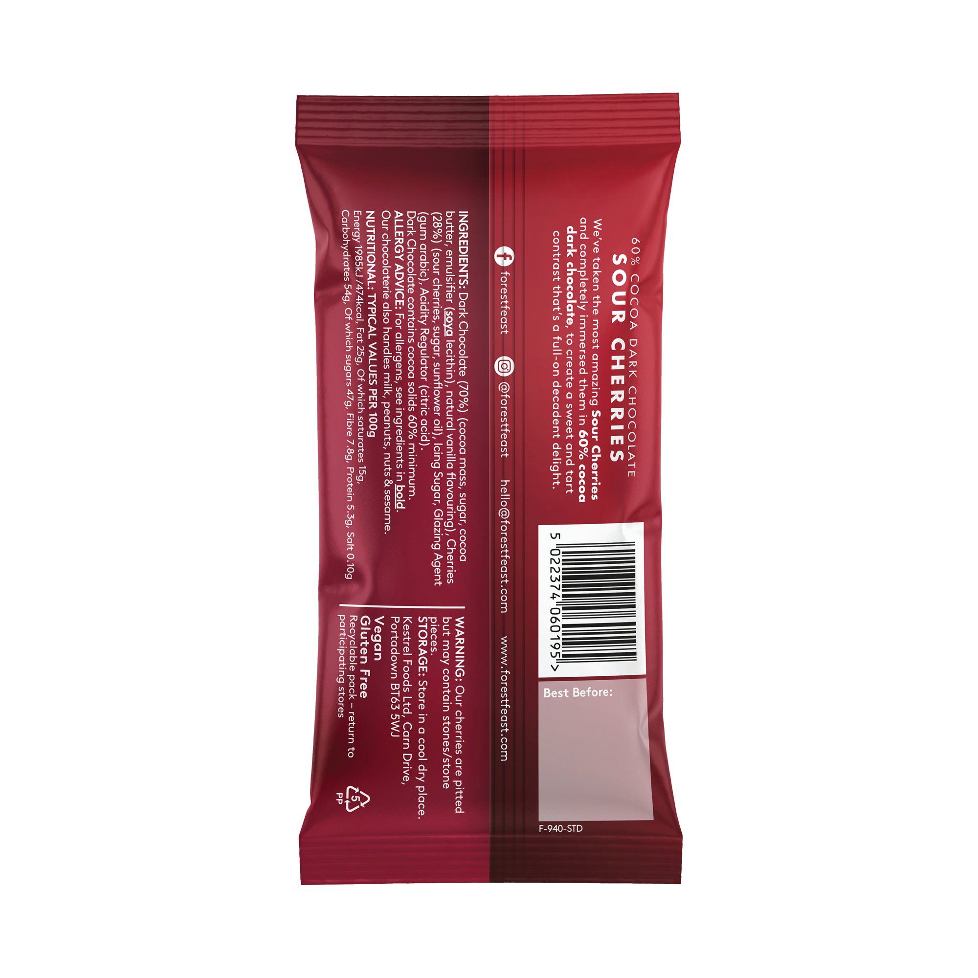 These Forest Feast, original snack explorers' chocolate sour cherries are completely immersed in 60% cocoa dark chocolate to create a sweet and tart contrast that is a decadent delight. Supplied in a pack of 12 40g pouches.