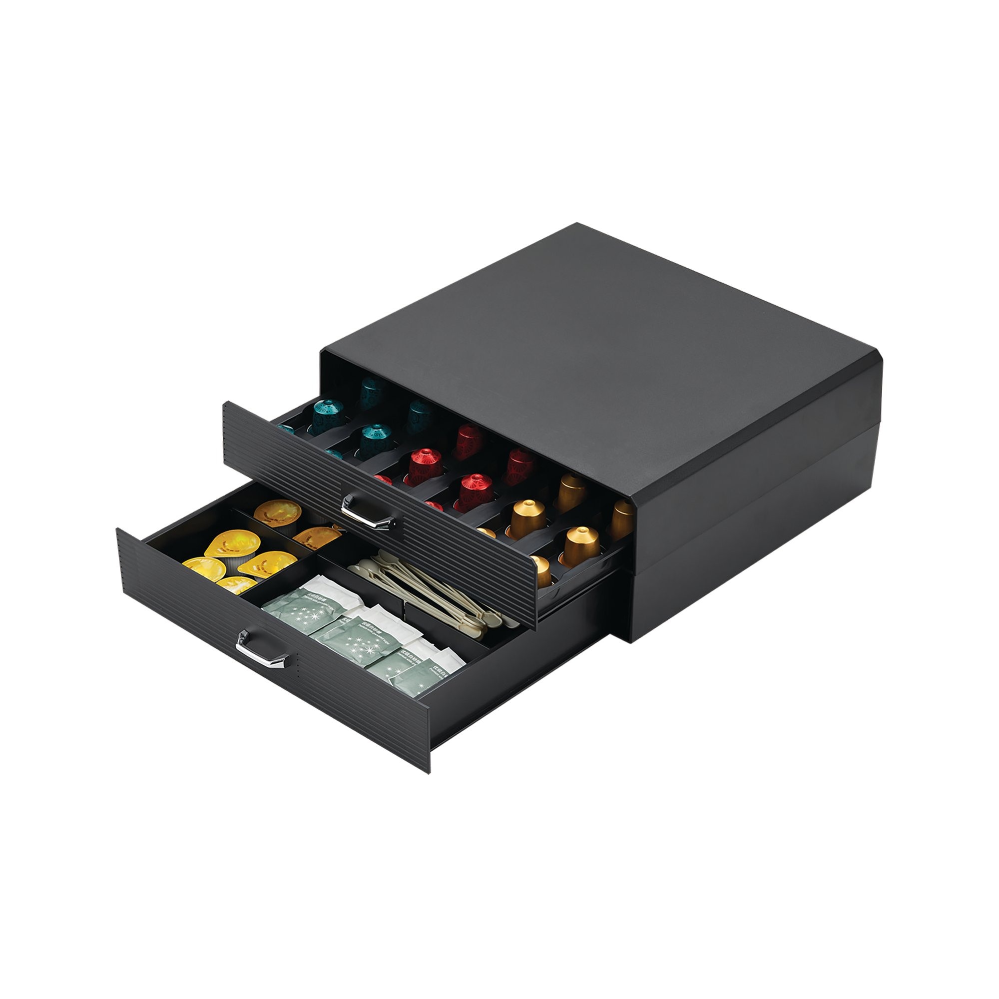These MyCafe coffee condiment double drawers are designed to hold coffee capsules and accessories. Featuring two drawers, they are ideal for storing and displaying pods, spoons, stirrers, napkins, sugars and creamers. Supplied in black.
