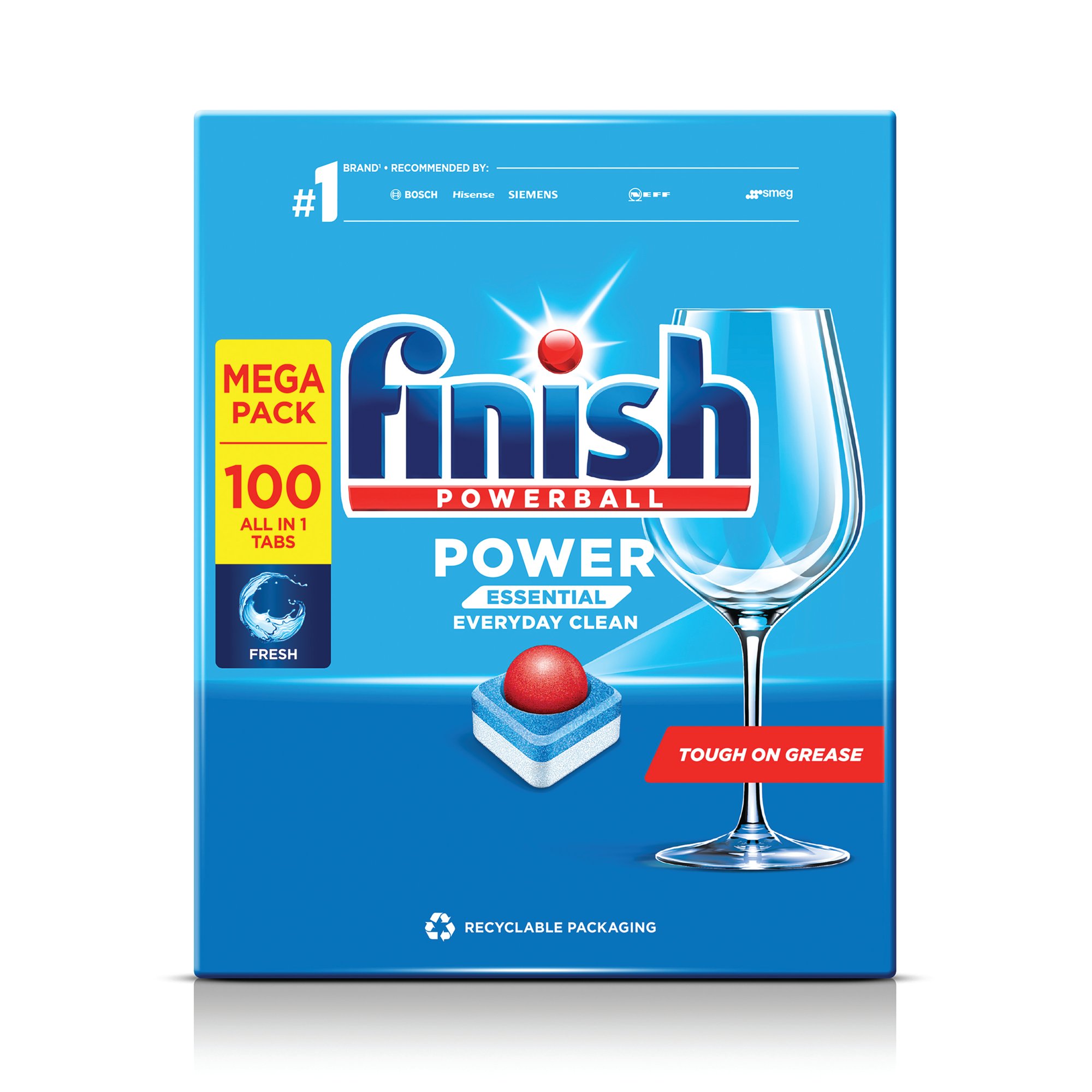 The Finish Power Essential dishwasher tablets provide clean and shining dishes first time, every time. The powerball supercharges the tablets to remove food and grease from dishes for everyday clean results. There are 100 tablets in this pack.