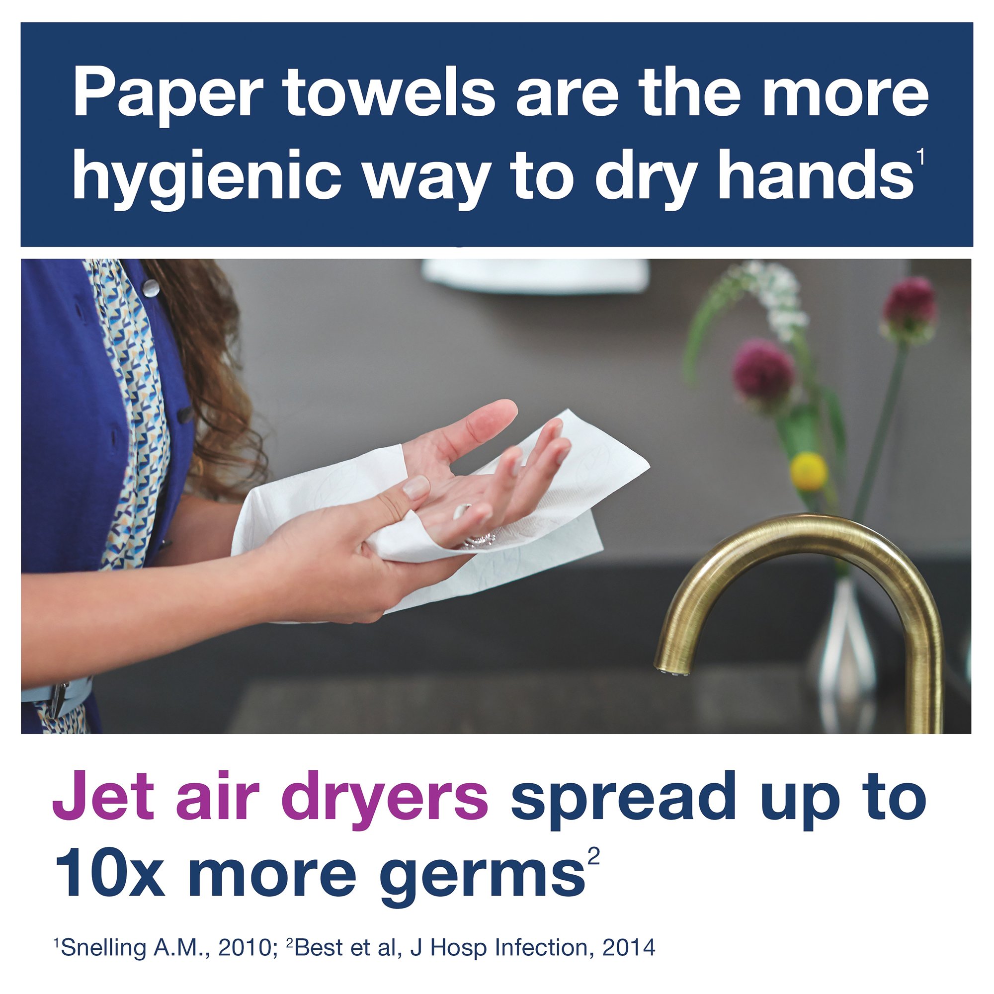 Increasing capacity in smaller dispensers with 50% compressed paper hand towels, these large paper towels are ultra-absorbent and tear-resistant, so guests use fewer sheets. The one-at-a-time dispensing helps reduce waste and improve hygiene, as guests only touch what they take. Supplied in a pack of 12 sleeves of 200 white paper towels (2400 towels in total).