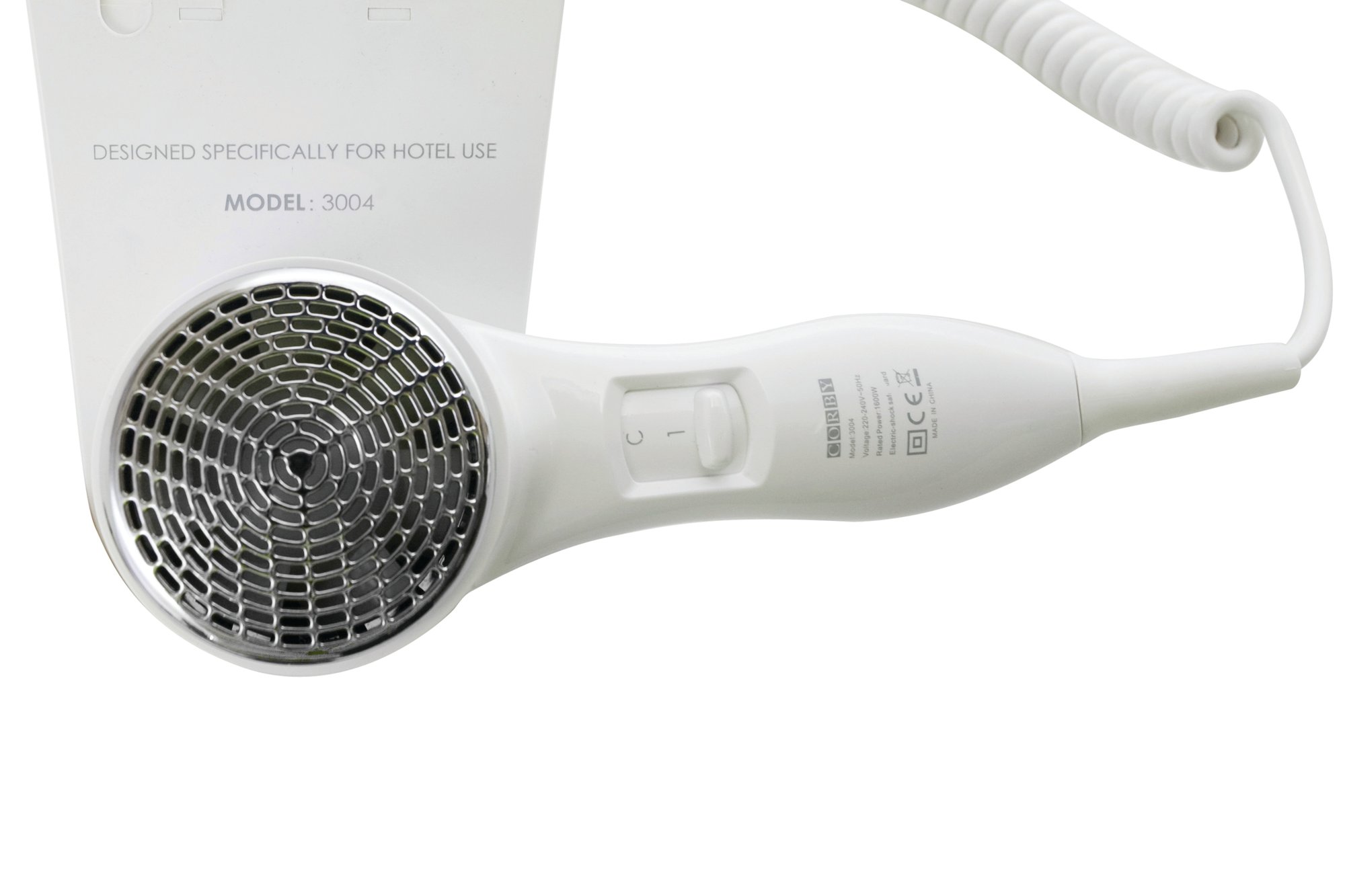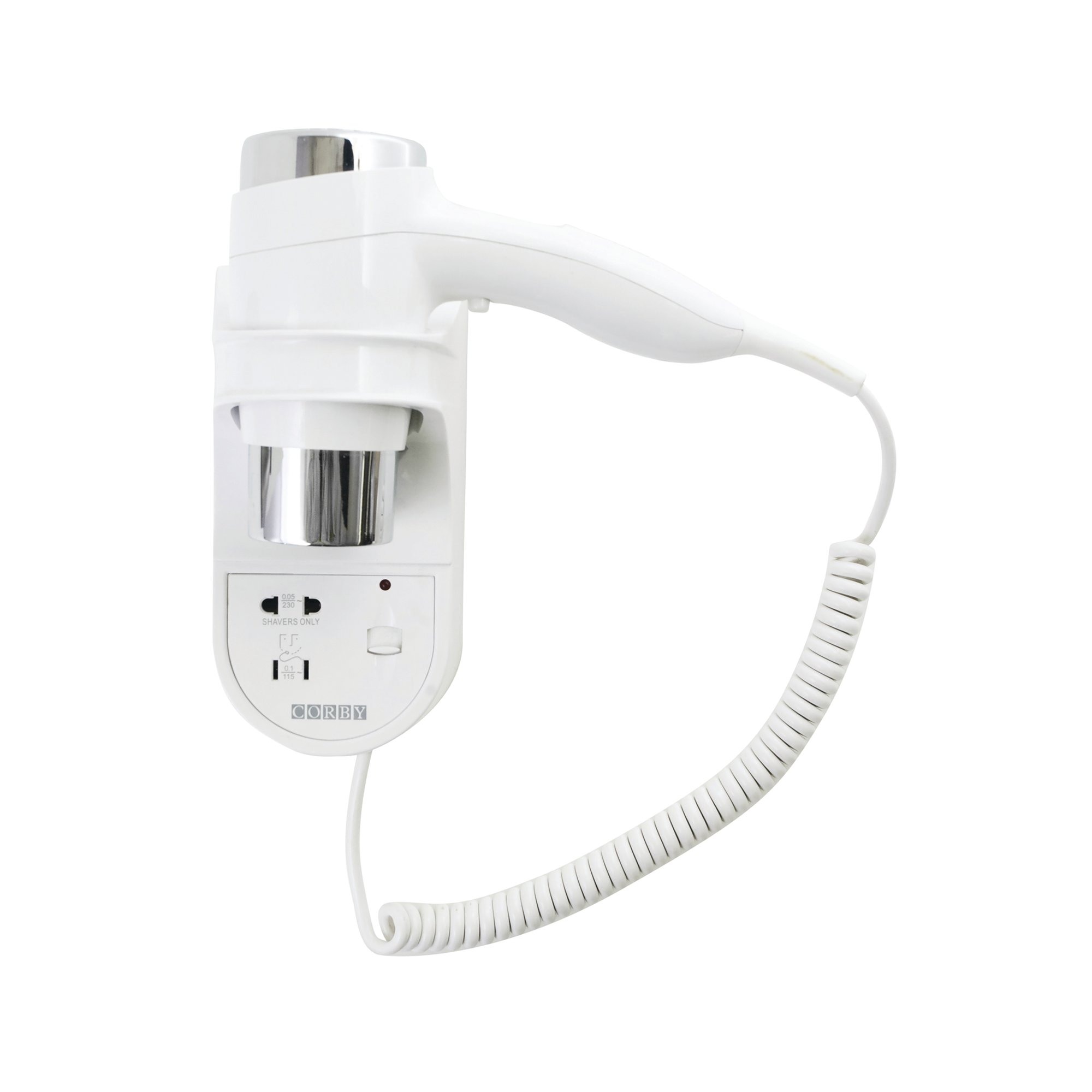 The Corby Kendal wall mounted hair dryer is specifically designed for the hotel bedroom. The hair dryer is supplied with a shaver socket and is a trigger activated for safety. Another feature is the 2 heat settings and cool blow option.