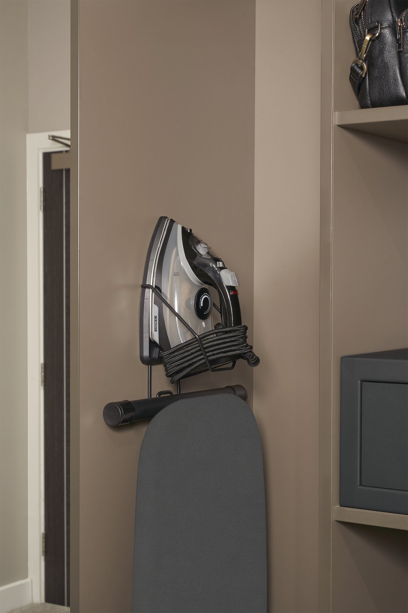 The Corby Oxford ironing board in black features a burn proof dark grey aluminised cover, which helps reflect heat for safe, fast and efficient ironing as well as preventing heat stains. Designed for both left and right-handed users with its dual sided opening mechanism your guests will be able to operate the lightweight Oxford ironing board with ease. Another great feature is the steam flow mesh board that allows steam to pass through clothing for effective ironing.