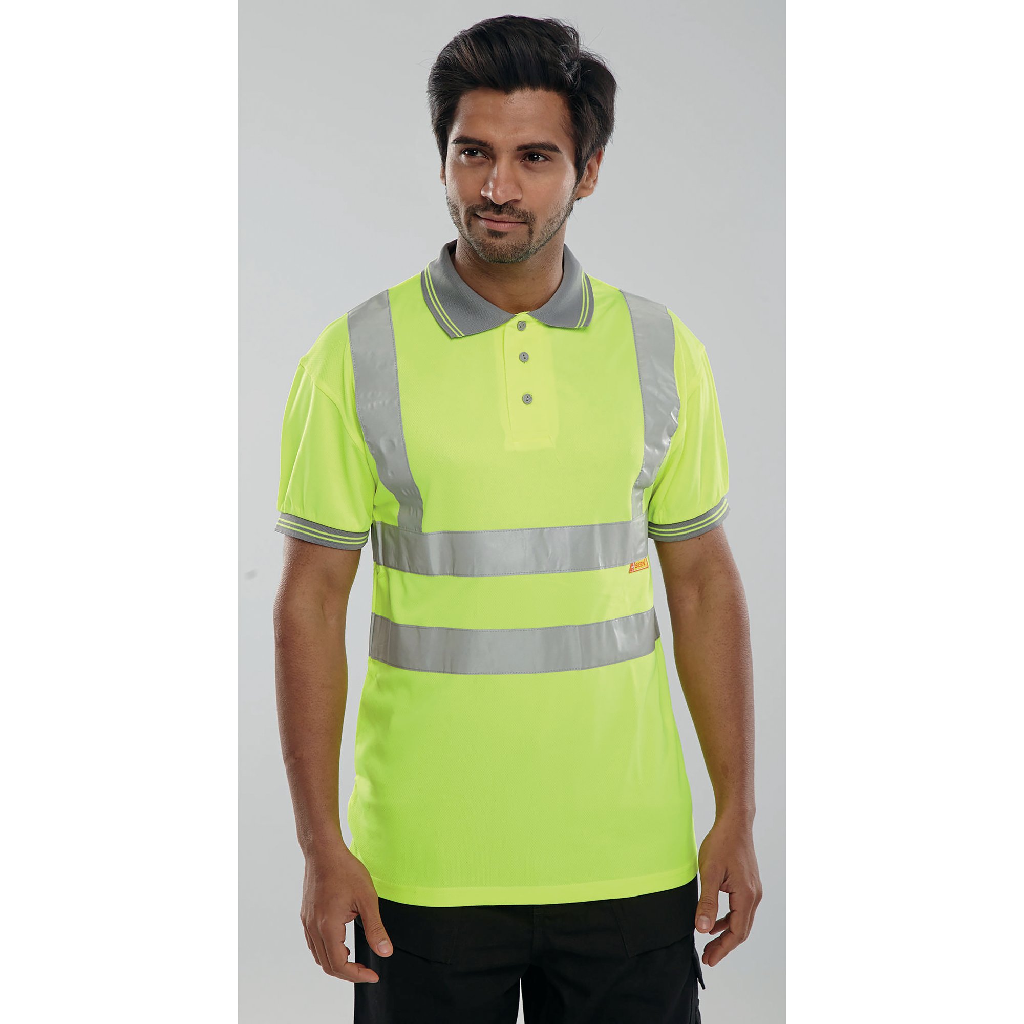 Beeswift short Sleeve High Visibility polo shirt made from 100% polyester Bird Eye fabric. Features 3 button placket, grey trim to collar and cuffs and retro-reflective tape. Machine washable at 40 degrees C up to a maximum of 25 wash cycles.