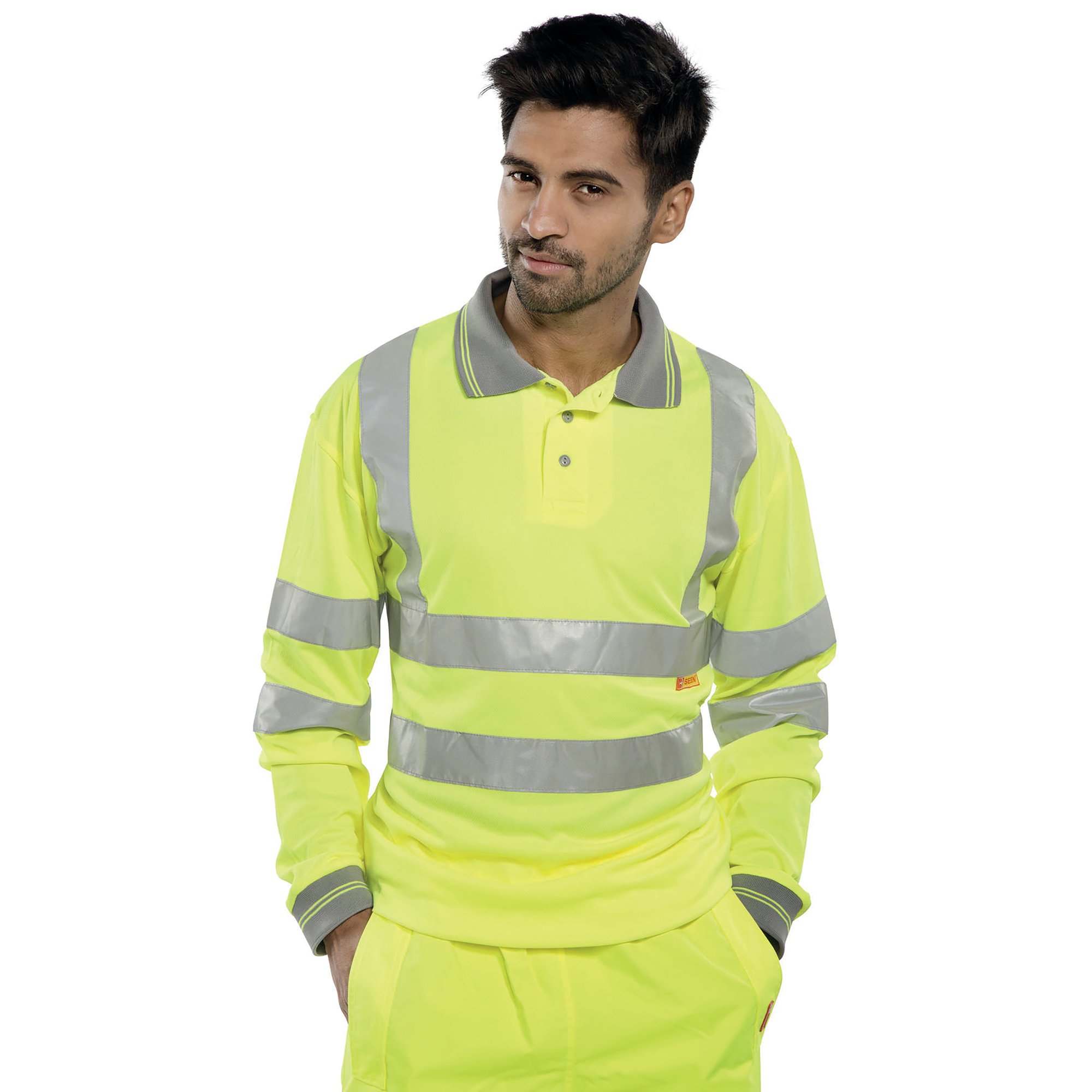 Beeswift High Visibility long Sleeve polo shirt made from 100% polyester Bird Eye fabric. Features 3 button placket, grey trim to collar and cuffs and retro-reflective tape. Available in sizes S - 5xL. Machine washable at 40 degrees C up to a maximum of 25 wash cycles.