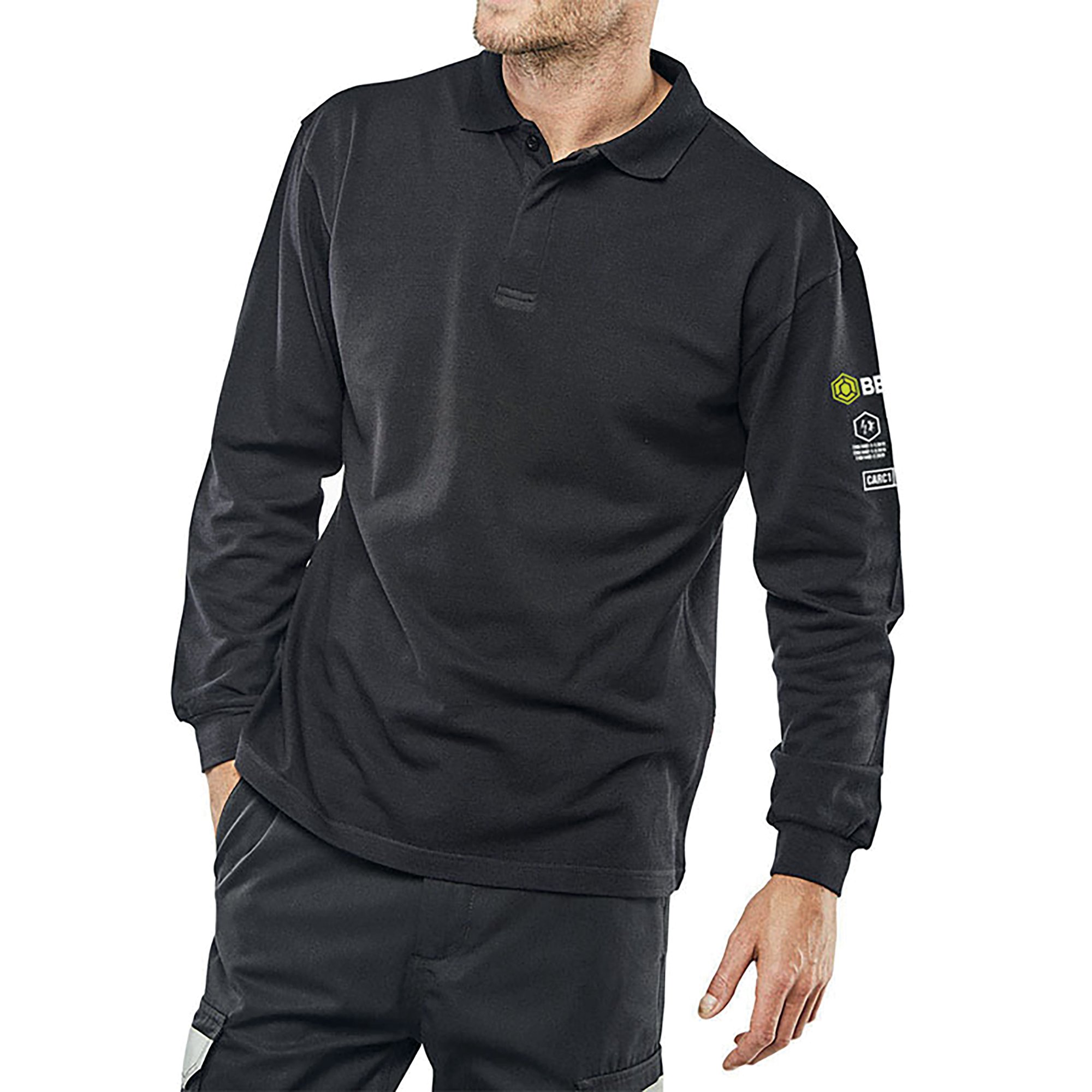 Flame Retardant. Anti-Static. Arc long Sleeve polo shirt made from 210gsm 60/40 Modacrylic/cotton blend Pique fabric. Inherently flame retardant fabric. FR properties will not diminish with repeated laundering. For industrial workers exposed to heat. Not suitable for fire fighters. 3 Button placket. Ribbed cuffs. Robust yet soft and comfortable to wear. EN ISO 13688:2013 - General requirements for protective clothing EN 1149-3:2004 - anti-static - Test methods for measurements of charge decay EN 1149-5:2008 - anti-static - Material performance and design requirements EN ISO 11612:2015 (A1 A2 B1 C1) - Protection against heat and flame Arc FLASH IEC 61482-2:2009 - Performance requirements and design requirements EN 61482-1-2:2007 (Class 1 4kA) - Box Arc testing EN 61482-1-1:2009 (EBT50 5.0 Cal/cm2) - Open Arc testing. Each garment style is independently tested to both Box and open Arc standards. Click Arc production is covered by article 11B certification.