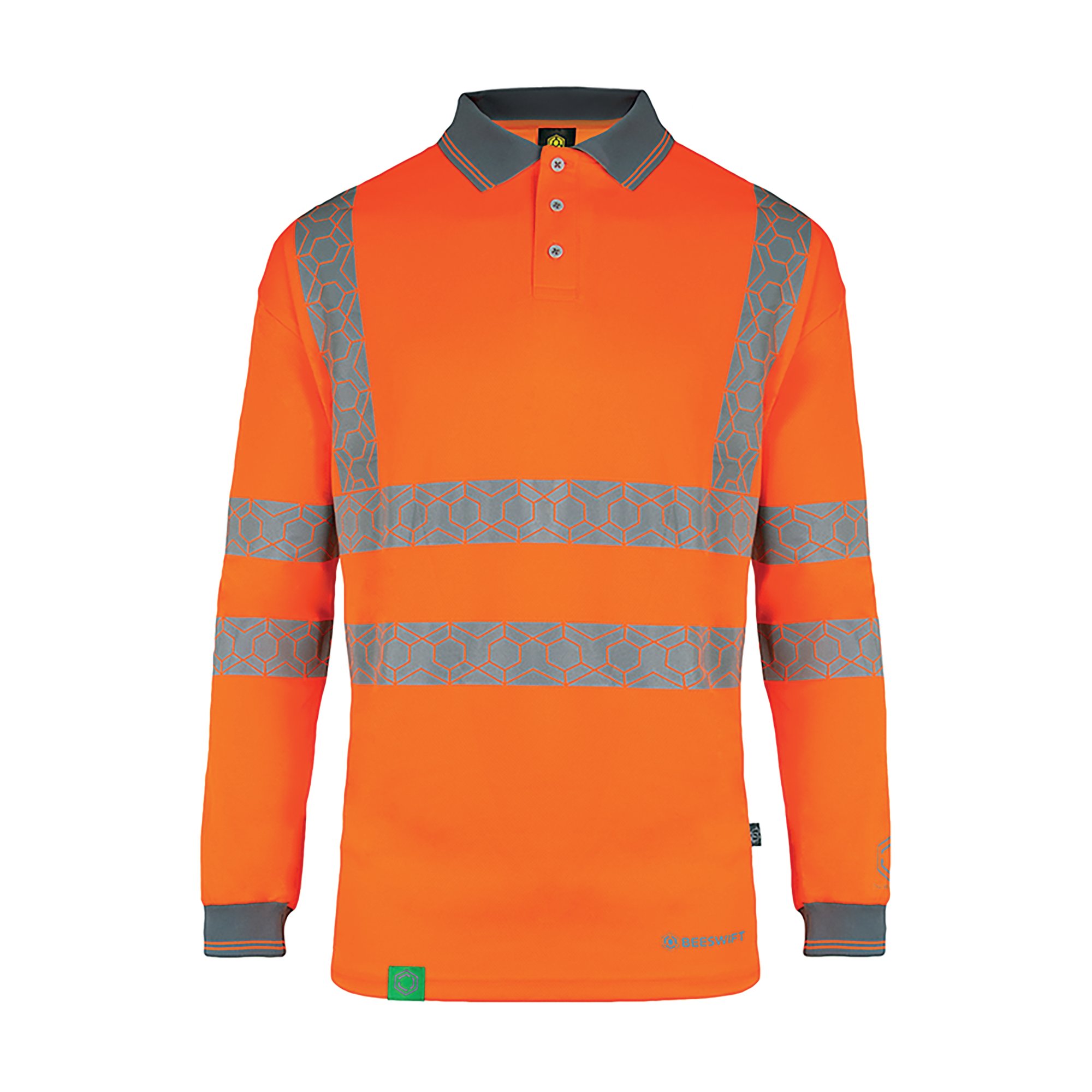 High Visibility long sleeved polo shirt made from recyclable fabric. Rpet generated from the recycling process can be made into yarn and reused for all types of polyester clothing. Made from 160gsm 100% polyester Bird eye fabric and featuring a 3 button placket and grey trim to collar and cuffs. Conforms to EN ISO 20471 Class 3 High Visibility.