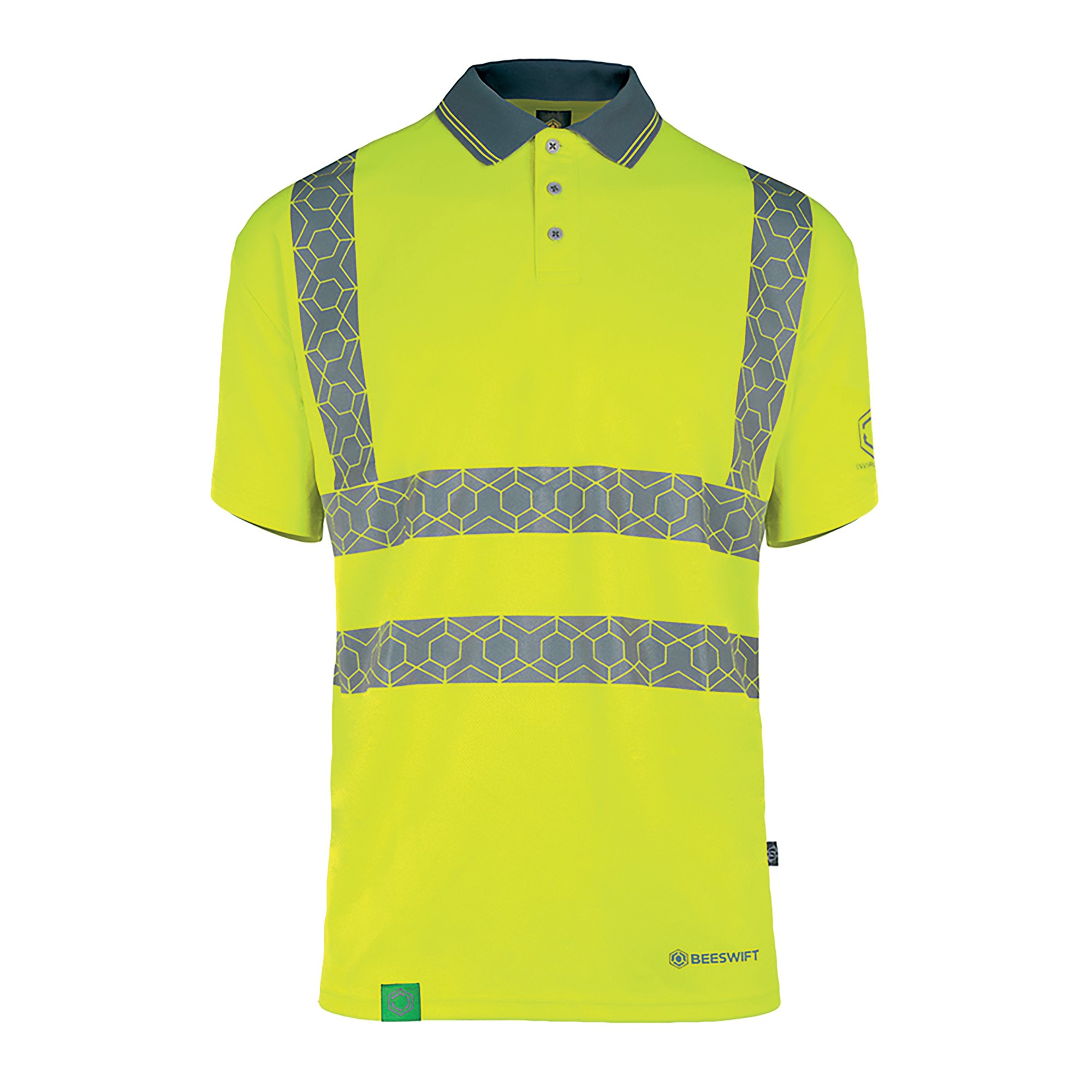 High Visibility short sleeved polo shirt made from recyclable fabric. Rpet generated from the recycling process can be made into yarn and reused for all types of polyester clothing. Made from 160gsm 100% polyester Bird eye fabric and featuring a 3 button placket and grey trim to collar and cuffs. conforms to EN ISO 20471 Class 2 High Visibility.