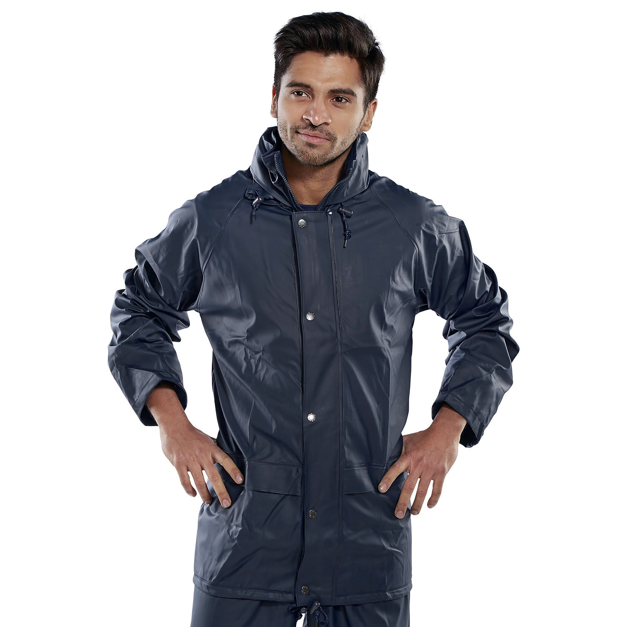 Beeswift Super B-Dri Weather Proof Jacket has a concealed hood, full zip front with double storm flap and self double yoke back. The jacket features lower pockets with flap, elasticated wind cuffs, stitched and welded seams. Made from Polyester with PU coating.