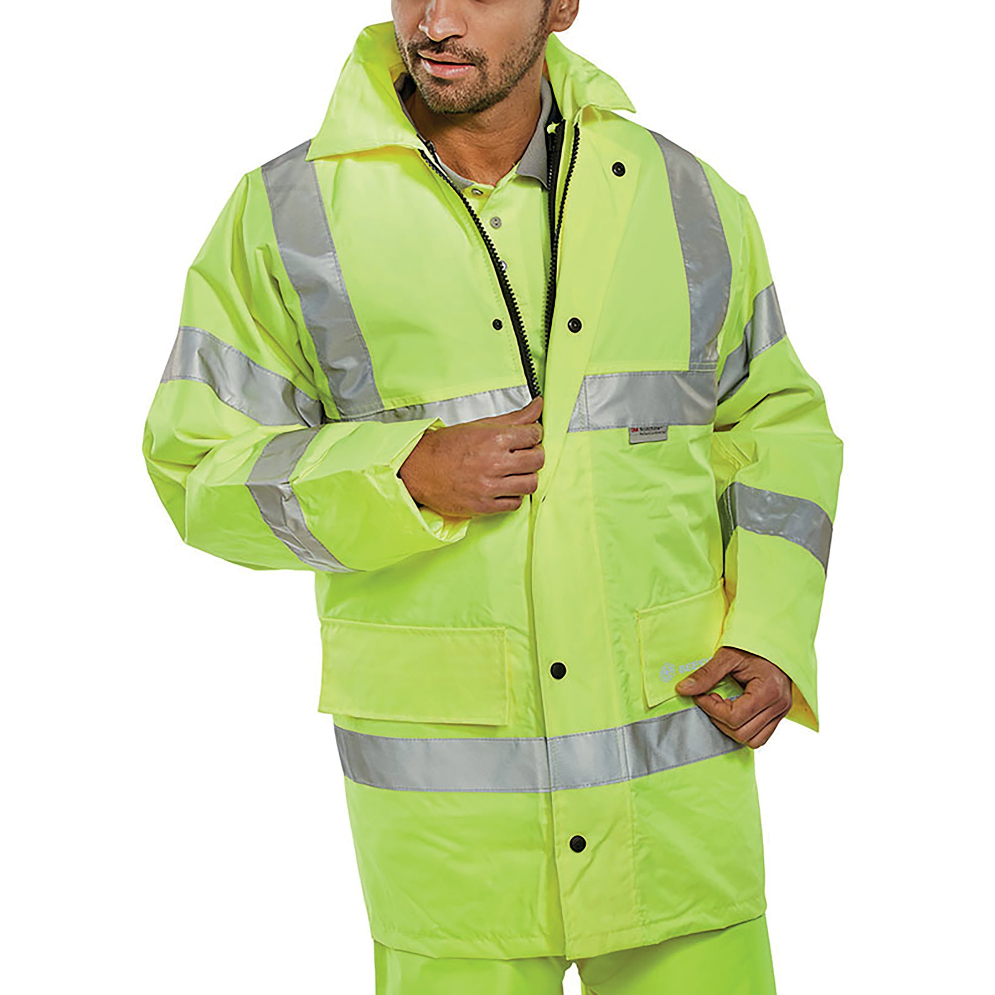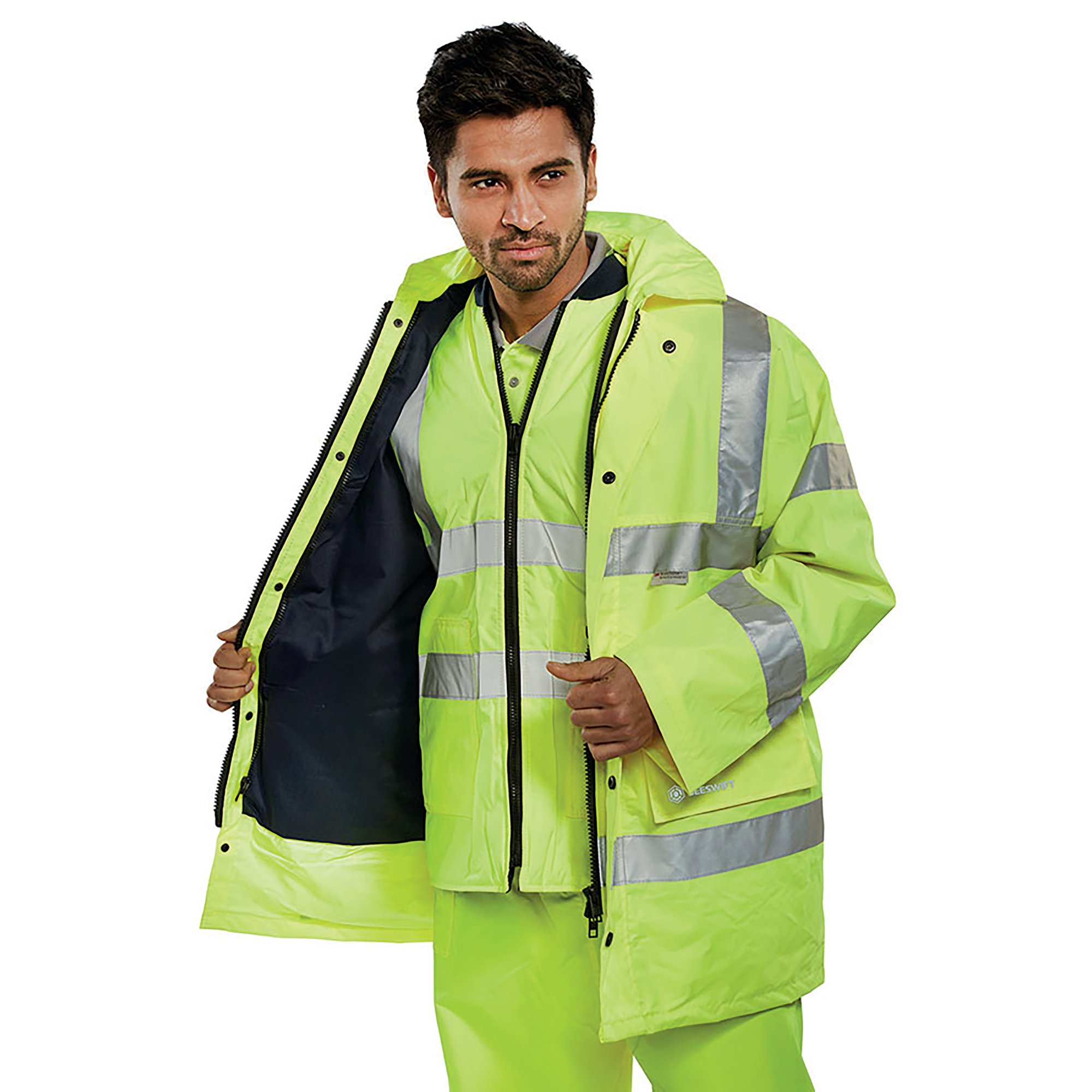 Beeswift 4 In 1 High Visibility Jacket and Bodywarmer. The outer jacket is made from heavyweight PU coated polyester with a Nylon lining. It features a concealed hood, two-way heavy weight zip with storm flap, 2 lower hip pockets with flaps, knitted storm cuffs and fully taped seams. The inner bodywarmer is a reversible zipout with a PU coating to High Visibility side. It has a knitted collar, heavy duty zip, 2 patch pockets on quilted side, fully taped seams and reflective Material. The jacket Conforms to EN ISO20471 Class 3 High Visibility, Conforms to EN 343 Class 3 Water Penetration Class 1 Air Permeability. The inner Bodywarmer confirms to EN ISO20471 Class 2 High Visibility.