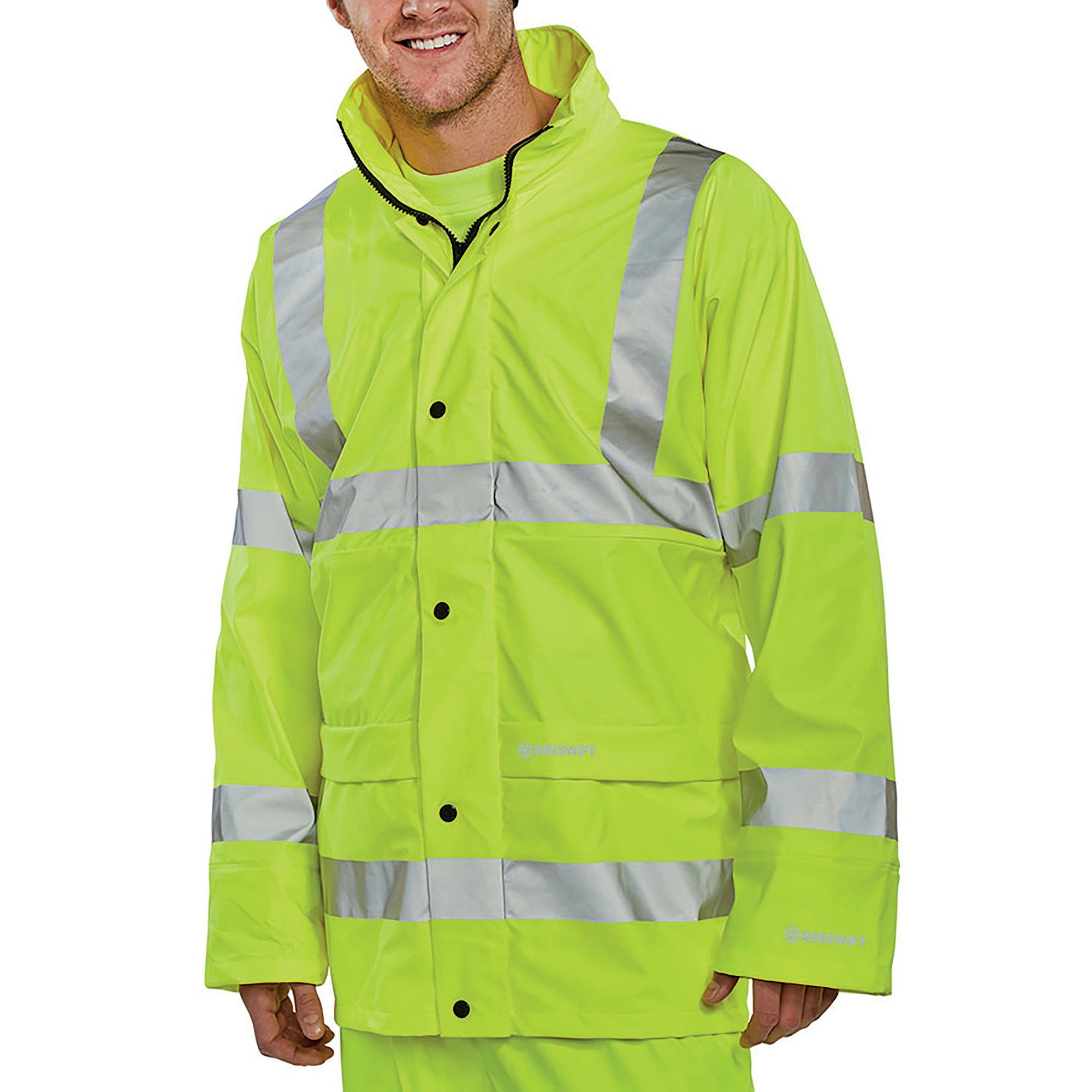 Beeswift Super B-Dri High Visibility Jacket is made from breathable fabric, Polyester with PU coating. Featuring a concealed hood, full zip front with double storm flap, self double yoke back, lower pockets with flap, elasticated storm cuffs, stitched and welded seams and reflective material. EN ISO20471 Class 3 High Visibility. EN343 Class 3 Resistance to Water Penetration Class 1 Air Permeability.