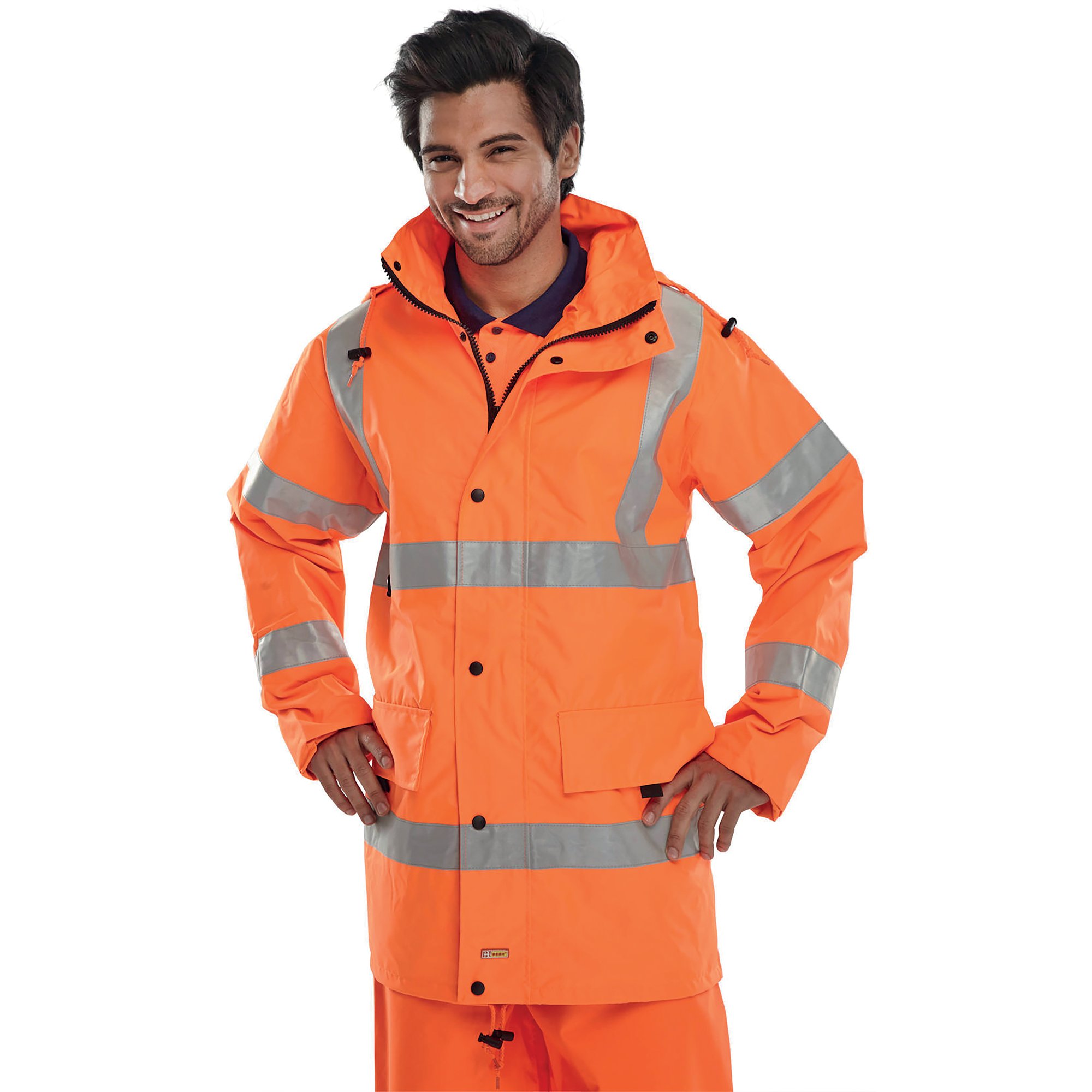 The Beeswift Jubilee High Visibility Jacket has a fixed hood with drawcord, two-way heavy duty zip front with storm flap and two lower front patch pockets with hook and loop fastening flap. The jacket also features an ID card D- Ring, drawcord at hip, internal mesh lining with mobile phone pocket, two roomy poachers pockets at lower front, deep left breast zipped security pocket under front flap. as Well as knitted storm cuffs, internal wicking strip, fully taped seams and retro-reflective tape. EN ISO 20471 Class 3 High Visibility. EN 343 Class 3 Water Penetration Class 3 Air Permeability.
