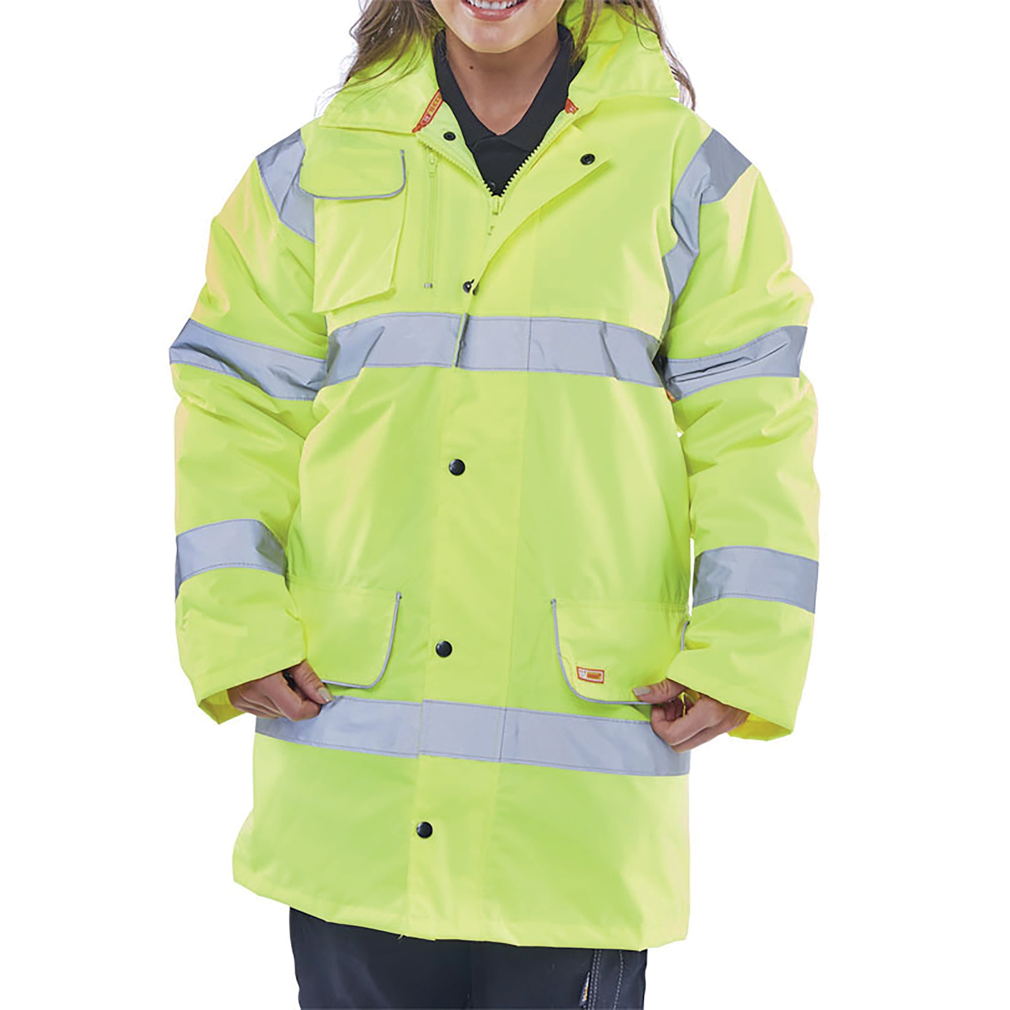 The Beeswift Fleece Lined High Visibility Traffic Jacket is made from PU coated polyester. The jacket is fleece lined and comes with a concealed hood. Featuring two-way heavy duty zip front with storm flap and security pocket, 2 lower pockets with flaps, right hand chest pocket with flap. It also has an inside breast pocket, knitted storm cuffs, internal wicking strip, fully taped seams and retro-reflective tape. EN ISO20471:2013 Class 3. EN343:2003 + A1:2007 Class 3 Water Penetration Class 1 Air Permeability.