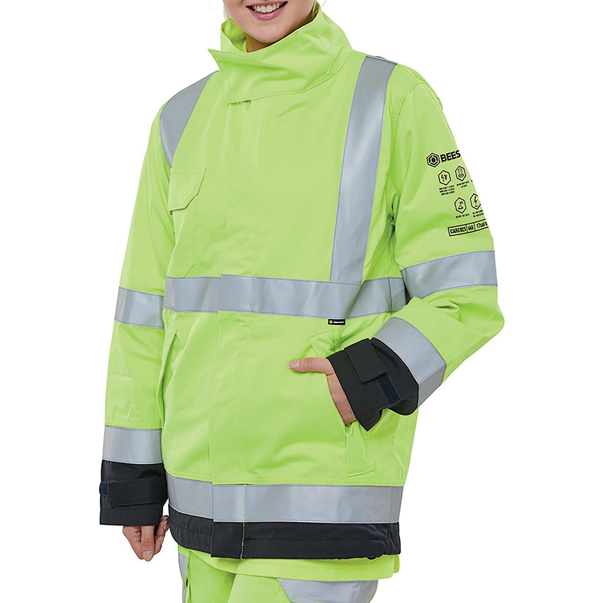 Beeswift Two Tone ARC Woven High Visibility Jacket Fire Retardant Anti-static. Made from 300gsm 60/40 Modacrylic/cotton blend. Featuring Triple stitch construction, 2 Lower pockets, large qualifying icons on left arm. EN ISO 13688:2013 - General requirements for protective clothing. ARC FLASH - IEC 61482-2:2009 - Performance requirements and design requirements. EN 61482-1-2:2007 (Class 1 4kA) - Box Arc testing. EN 61482-1-1:2009 (ATPV 10.8 Cal/cm2) - Open Arc testing.
